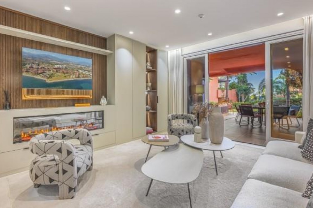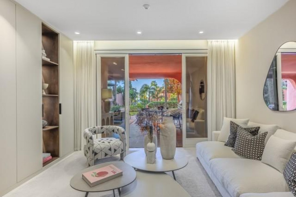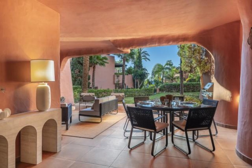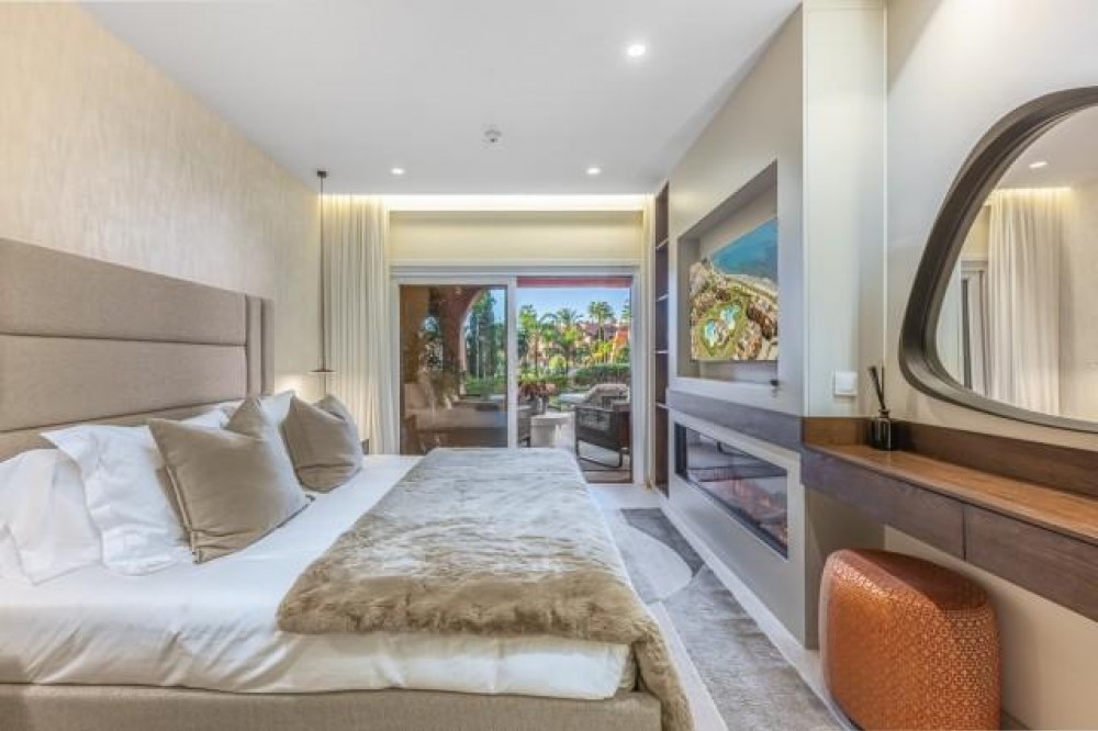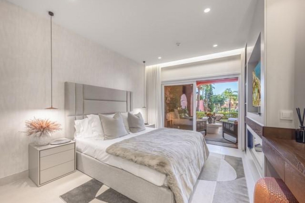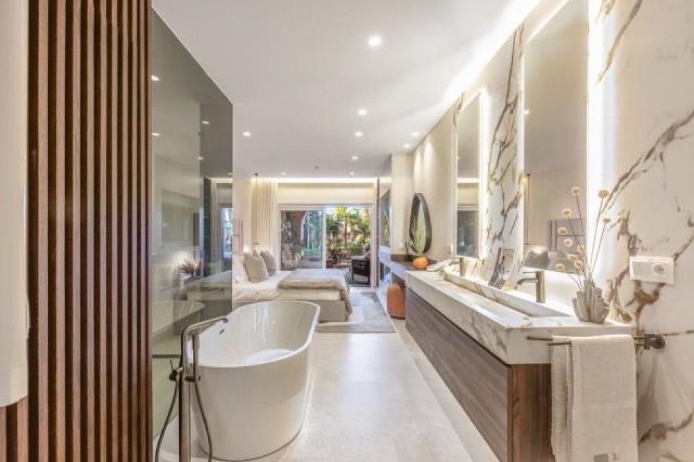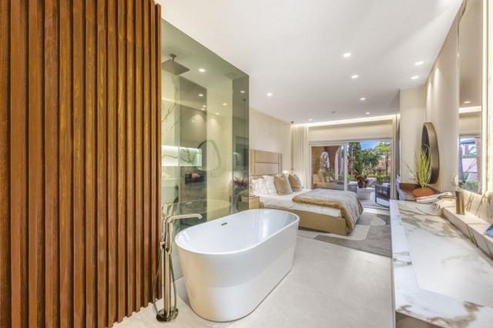 - Dit prachtig gerenoveerde appartement op de begane grond, gelegen in een van de meest prestigieuze strandwijken van Estepona, biedt een verfijnde kustbeleving met een rustig uitzicht over weelderige, aangelegde tuinen. Het appartement is volledig gerenoveerd volgens de hoogste normen en combineert een eigentijds design met uitzonderlijk comfort in een omgeving die zowel privé als exclusief aanvoelt. Het appartement biedt een royale woonoppervlakte van 142 m², aangevuld met een indrukwekkend privéterras van 60 m² dat de leefruimte naar buiten uitbreidt. Het open interieur is zorgvuldig ontworpen om licht en ruimte te maximaliseren, waardoor een naadloze verbinding ontstaat tussen de woonkamer, eetruimte en het terras. Elegante vloeren, op maat gemaakte afwerkingen en zorgvuldig geselecteerde materialen geven de woning een verfijnde maar gastvrije sfeer, ideaal voor zowel permanent wonen als luxe vakanties. De designkeuken is een opvallend kenmerk, uitgerust met hoogwaardige apparatuur en innovatieve oplossingen die stijl en functionaliteit combineren. Hoogwaardige details zoals een onzichtbare inductiekookplaat, dubbele vaatwasser, geïntegreerde Thermomix en een verborgen wasruimte weerspiegelen de aandacht die aan elk element van de renovatie is besteed. De woonkamer wordt verfraaid door een elektrische open haard en een Bang & Olufsen geluidssysteem, waardoor een verfijnde ruimte ontstaat om te ontspannen en gasten te ontvangen. Alle drie de slaapkamers zijn ontworpen als privétoevluchtsoorden, elk met een eigen en-suite badkamer. Op maat gemaakte kledingkasten, een ruime inloopkast en spa-achtige badkamers met voorzieningen zoals een vrijstaand bad en Japanse toiletten dragen bij aan het gevoel van ingetogen luxe. Vloerverwarming in het hele appartement zorgt voor comfort het hele jaar door, terwijl dubbele beglazing zowel de isolatie als de rust verbetert. De woning is gelegen in een afgesloten complex aan het strand, bekend om zijn weelderige tropische tuinen, uitzonderlijke privacy en vijfsterrenfaciliteiten. Bewoners genieten van 24-uursbeveiliging, directe toegang tot het strand en de boulevard, meerdere buitenzwembaden, een verwarmd binnenzwembad, volledig uitgeruste fitnessruimtes en sauna's. Verschillende hoogwaardige restaurants bevinden zich op loopafstand, waardoor dit een ideale locatie is voor wie op zoek is naar een ontspannen maar verfijnde levensstijl aan zee. De woning wordt gecompleteerd door een ondergrondse parkeerplaats en een privéberging, wat het comfort verder verhoogt. Dit appartement biedt een zeldzame kans om een volledig gerenoveerde woning aan het strand te bemachtigen in een van de meest exclusieve woonwijken van Estepona, perfect geschikt voor veeleisende kopers die op zoek zijn naar luxe, comfort en een onovertroffen locatie aan de kust.