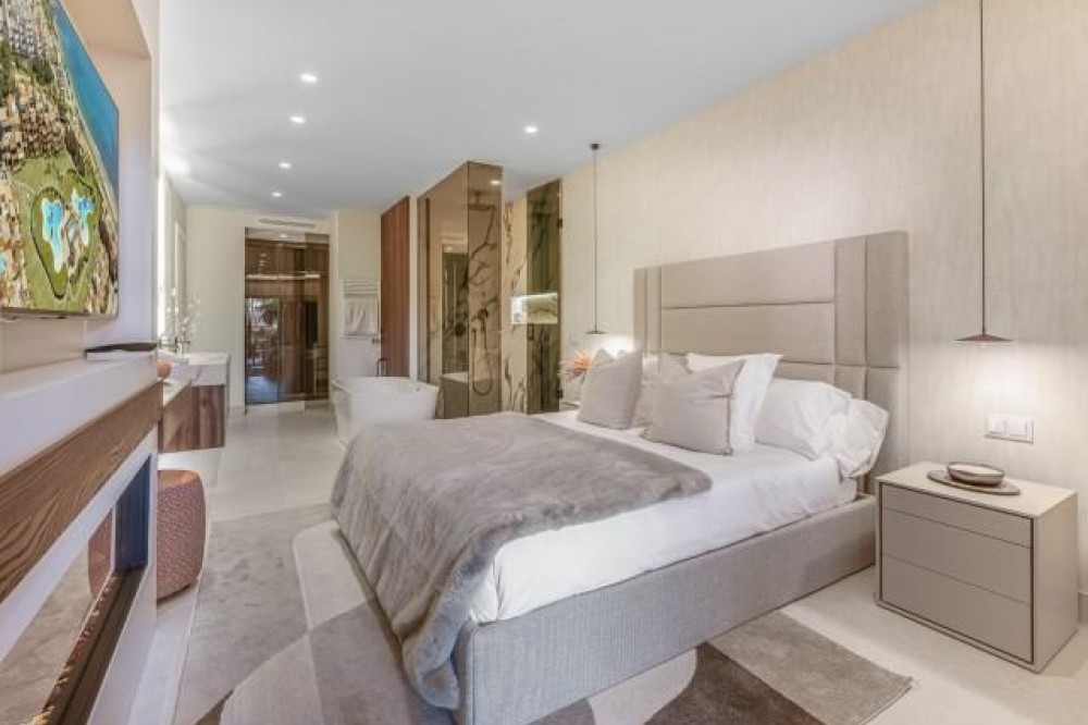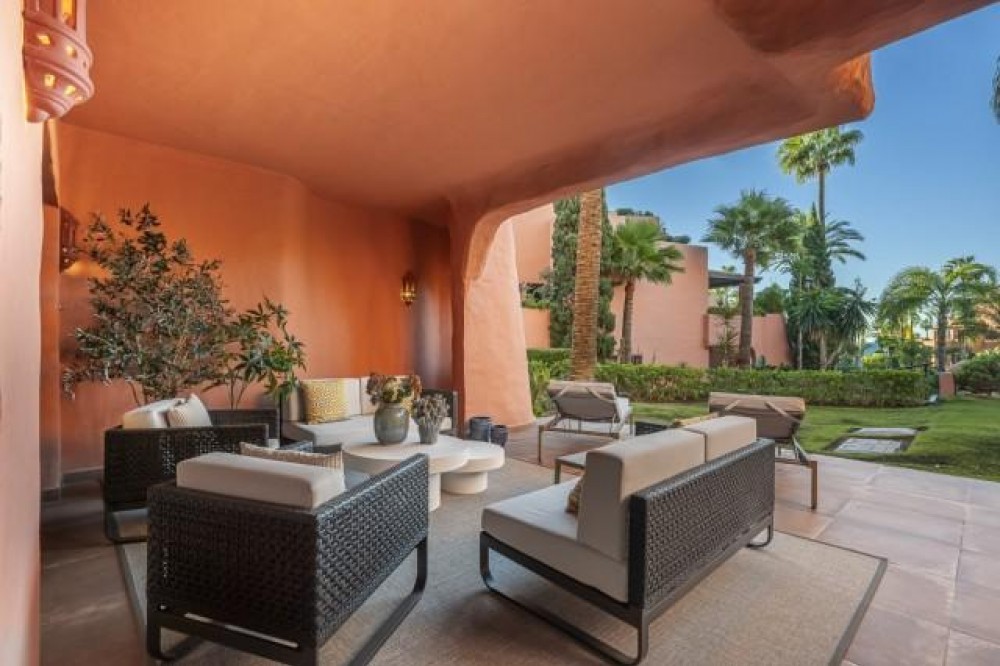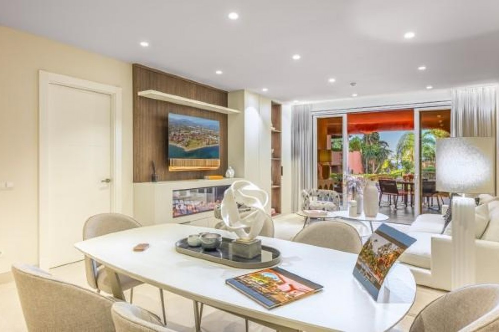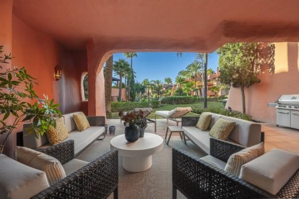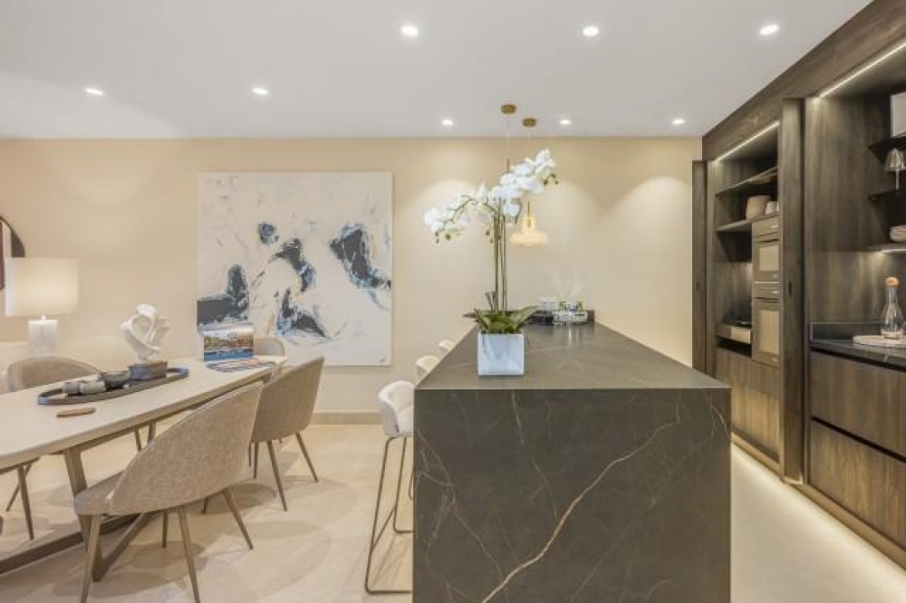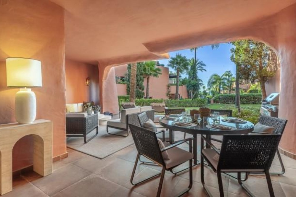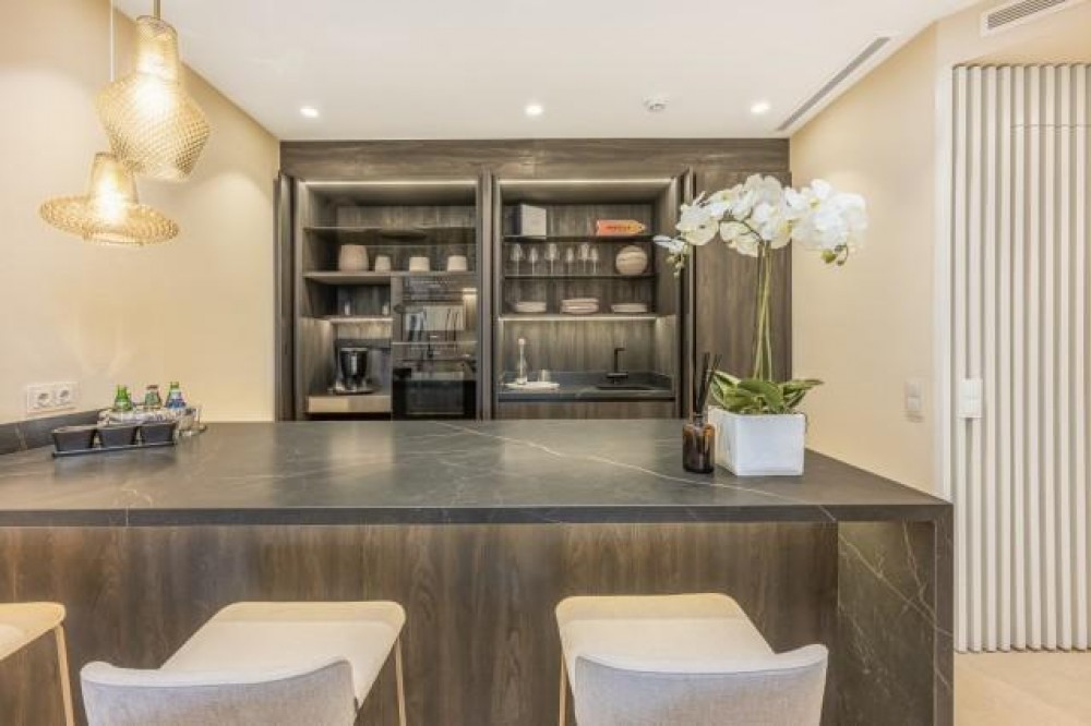 - Dit prachtig gerenoveerde appartement op de begane grond, gelegen in een van de meest prestigieuze strandwijken van Estepona, biedt een verfijnde kustbeleving met een rustig uitzicht over weelderige, aangelegde tuinen. Het appartement is volledig gerenoveerd volgens de hoogste normen en combineert een eigentijds design met uitzonderlijk comfort in een omgeving die zowel privé als exclusief aanvoelt. Het appartement biedt een royale woonoppervlakte van 142 m², aangevuld met een indrukwekkend privéterras van 60 m² dat de leefruimte naar buiten uitbreidt. Het open interieur is zorgvuldig ontworpen om licht en ruimte te maximaliseren, waardoor een naadloze verbinding ontstaat tussen de woonkamer, eetruimte en het terras. Elegante vloeren, op maat gemaakte afwerkingen en zorgvuldig geselecteerde materialen geven de woning een verfijnde maar gastvrije sfeer, ideaal voor zowel permanent wonen als luxe vakanties. De designkeuken is een opvallend kenmerk, uitgerust met hoogwaardige apparatuur en innovatieve oplossingen die stijl en functionaliteit combineren. Hoogwaardige details zoals een onzichtbare inductiekookplaat, dubbele vaatwasser, geïntegreerde Thermomix en een verborgen wasruimte weerspiegelen de aandacht die aan elk element van de renovatie is besteed. De woonkamer wordt verfraaid door een elektrische open haard en een Bang & Olufsen geluidssysteem, waardoor een verfijnde ruimte ontstaat om te ontspannen en gasten te ontvangen. Alle drie de slaapkamers zijn ontworpen als privétoevluchtsoorden, elk met een eigen en-suite badkamer. Op maat gemaakte kledingkasten, een ruime inloopkast en spa-achtige badkamers met voorzieningen zoals een vrijstaand bad en Japanse toiletten dragen bij aan het gevoel van ingetogen luxe. Vloerverwarming in het hele appartement zorgt voor comfort het hele jaar door, terwijl dubbele beglazing zowel de isolatie als de rust verbetert. De woning is gelegen in een afgesloten complex aan het strand, bekend om zijn weelderige tropische tuinen, uitzonderlijke privacy en vijfsterrenfaciliteiten. Bewoners genieten van 24-uursbeveiliging, directe toegang tot het strand en de boulevard, meerdere buitenzwembaden, een verwarmd binnenzwembad, volledig uitgeruste fitnessruimtes en sauna's. Verschillende hoogwaardige restaurants bevinden zich op loopafstand, waardoor dit een ideale locatie is voor wie op zoek is naar een ontspannen maar verfijnde levensstijl aan zee. De woning wordt gecompleteerd door een ondergrondse parkeerplaats en een privéberging, wat het comfort verder verhoogt. Dit appartement biedt een zeldzame kans om een volledig gerenoveerde woning aan het strand te bemachtigen in een van de meest exclusieve woonwijken van Estepona, perfect geschikt voor veeleisende kopers die op zoek zijn naar luxe, comfort en een onovertroffen locatie aan de kust.