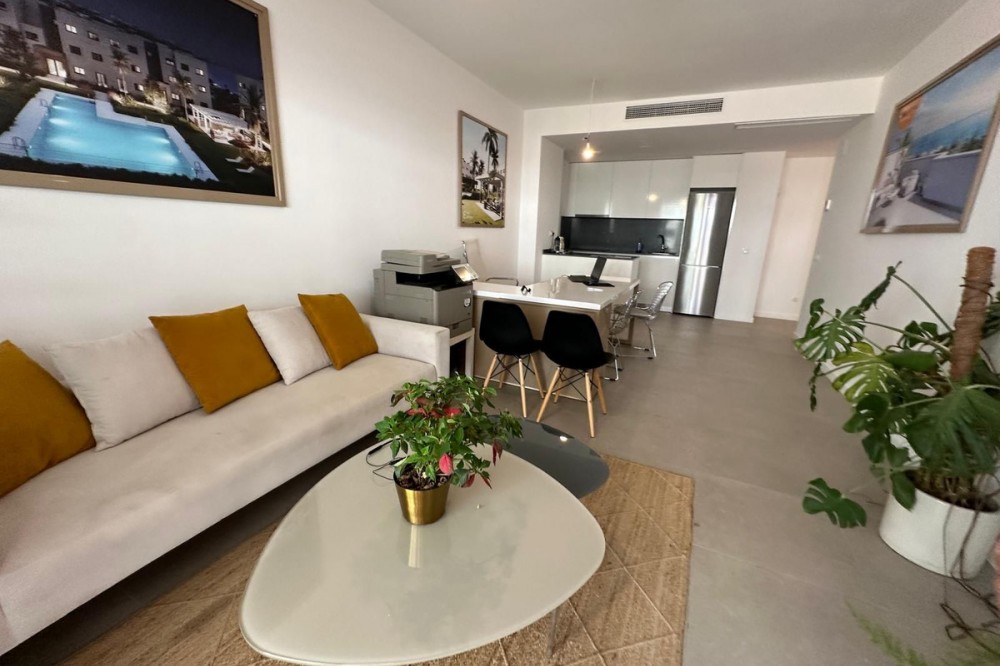 - Unique opportunity in a privileged area! This spectacular first-floor corner apartment is ideal for families or for those who enjoy the convenience of walking everywhere. With 82m² built and 62m² usable, the property has 2 bedrooms, 2 full bathrooms with furniture included and built-in wardrobes. Enjoy a large terrace perfect for relaxing while contemplating the panoramic views of the mountains and the community pool. The property stands out for its quality and excellent finishes: porcelain floors, double-glazed windows with thermal break and high-end appliances that guarantee durability and comfort. In addition, it includes centralized hot/cold air conditioning and electric heating for your maximum well-being. Located in a privileged area, close to the sea and all the necessary services such as restaurants, pharmacies and a nearby gym.