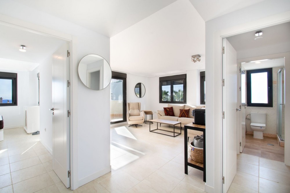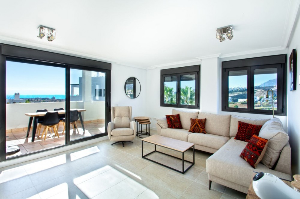 • LUXURIOUS DUPLEX PENTHOUSE WITH PANORAMIC SEA & MOUNTAINS VIEWS IN SELWO, ESTEPONA 2 parking spaces + 1 storage room included! Welcome to this stunning duplex penthouse nestled in the tranquil neighborhood of Selwo, Estepona, offering the epitome of modern luxury living. As you step into this spacious penthouse, you're greeted by an ambiance of elegance and comfort. Boasting two generously sized bedrooms and two exquisitely designed bathrooms, including a lavish en suite bathroom adjoined to the master bedroom, this residence is designed to cater to your every need. The heart of the home is the expansive living room, bathed in natural light and adorned with panoramic views of the sea and majestic mountains. Step outside onto the vast private terrace, where you can bask in the beauty of the lush communal gardens below and admire the tranquil vistas of the surrounding landscape. Prepare culinary delights in the fully equipped kitchen, complete with modern appliances and ample storage space. Convenience is key, with underground parking and a storage unit included in the package, ensuring a hassle-free lifestyle. Experience unparalleled brightness throughout the day, thanks to the west orientation of this remarkable apartment, offering abundant sunshine from dawn till dusk. Indulge in the lavish amenities of the development, including a sprawling communal swimming pool surrounded by lush tropical gardens, complete with a convenient dressing area for your comfort. Meander through the enchanting pathways that wind through the meticulously landscaped grounds, creating a serene oasis right at your doorstep. Rest assured with 24-hour security, including video surveillance, providing you with peace of mind and a sense of security. Don't miss the opportunity to call this exceptional penthouse your home, where luxury, comfort, and tranquility converge to create the ultimate living experience.