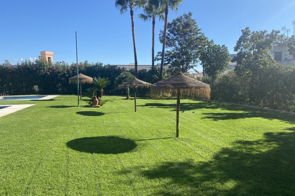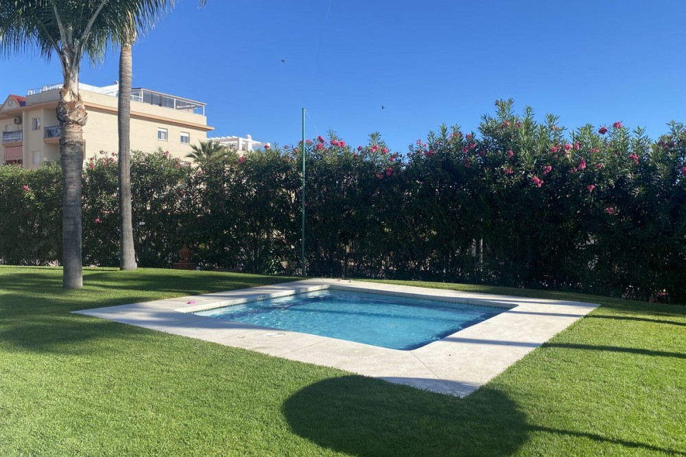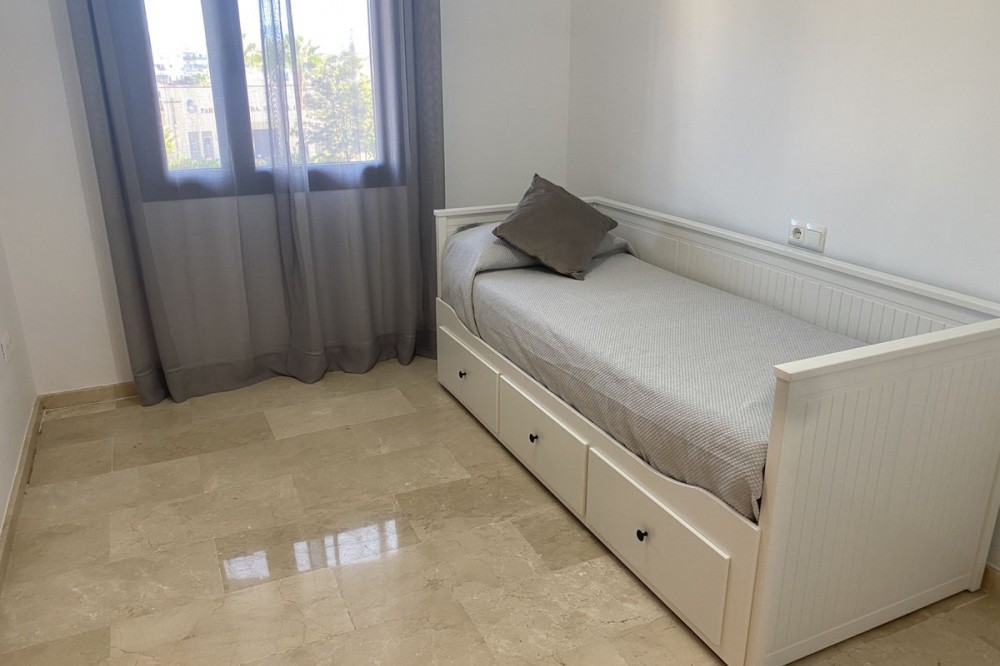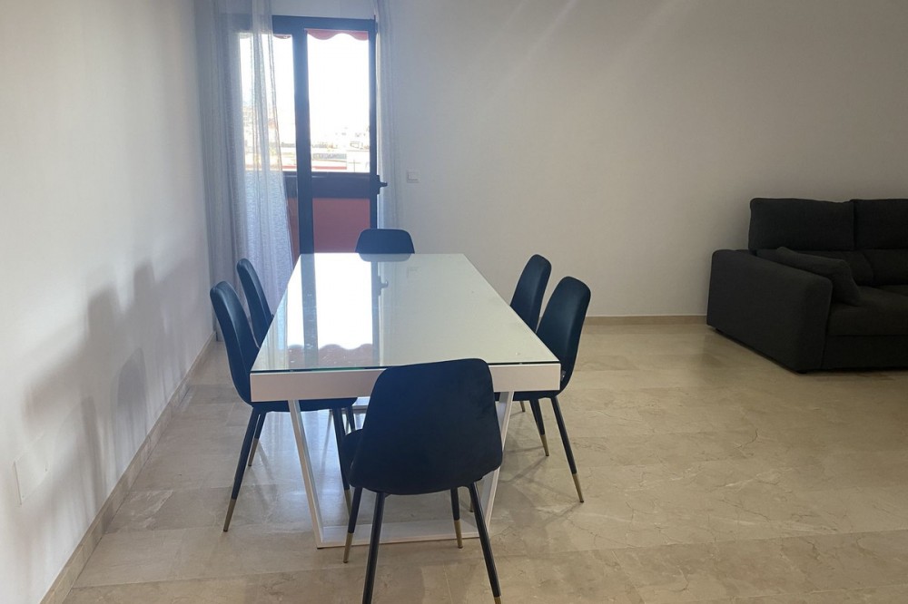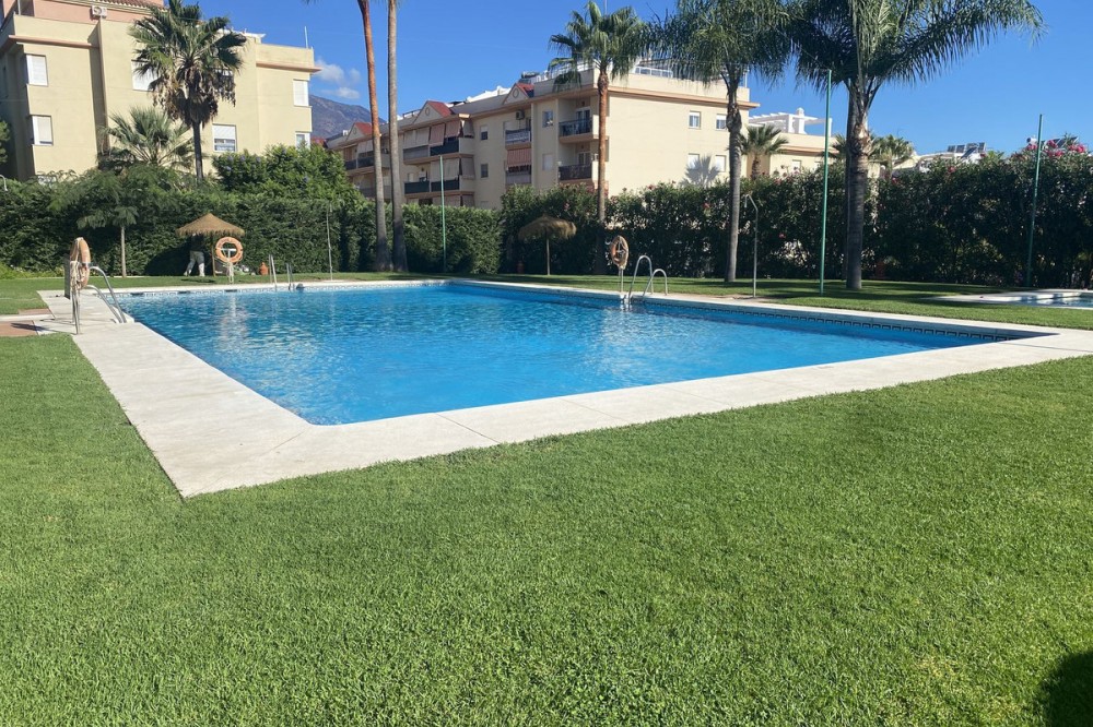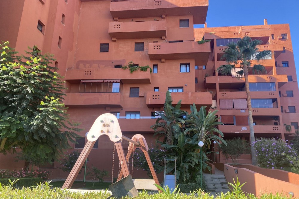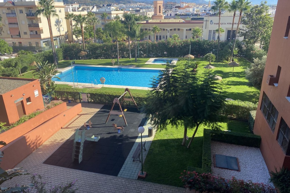 • This is a really spacious 3 bedroom, 2 bathroom apartment based in the really popular Balcones del Mar urbanisation in the centre of Estepona. Only 4 mins walk to the beach, it is a unique opportunity to own an apartment with parking and a communal swimming pool. The property has a large living room area with two terraces, and a third terrace from the master bedroom. The kitchen is fully equipped and has a good sized utility space adjoined. The three bedrooms are all a great size, and all three terraces have great views. The urbanisation has a lovely pool area, with grass surround. Very popular with families. The urbaniation also has a children's playground. The property is located on the second floor, and has a lift. Underground parking is included. A great apartment for all year round living or as a holiday home