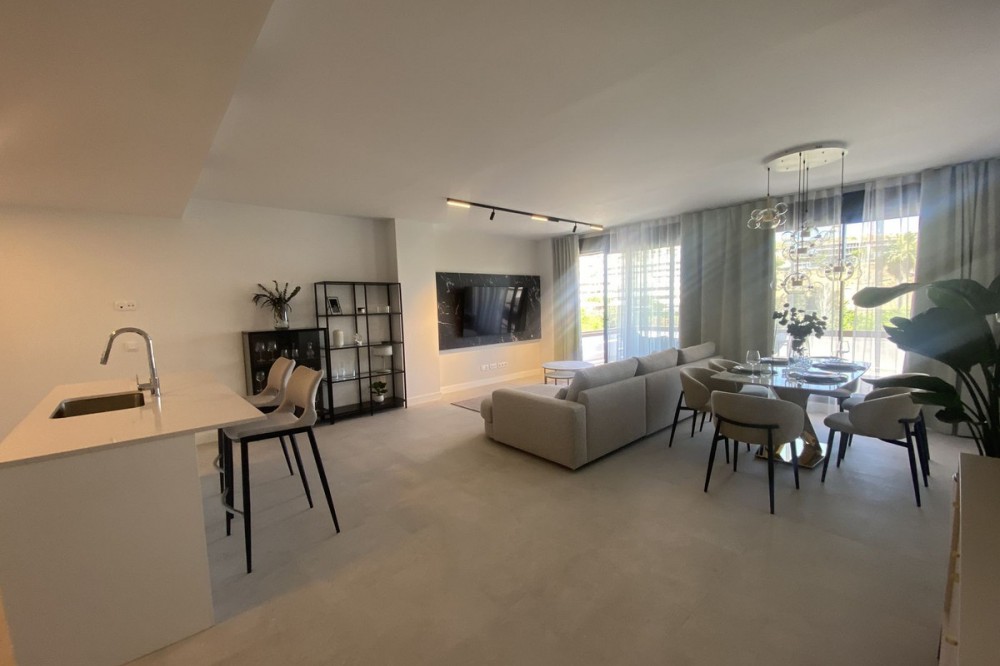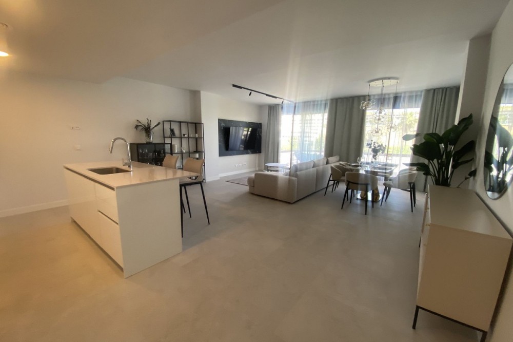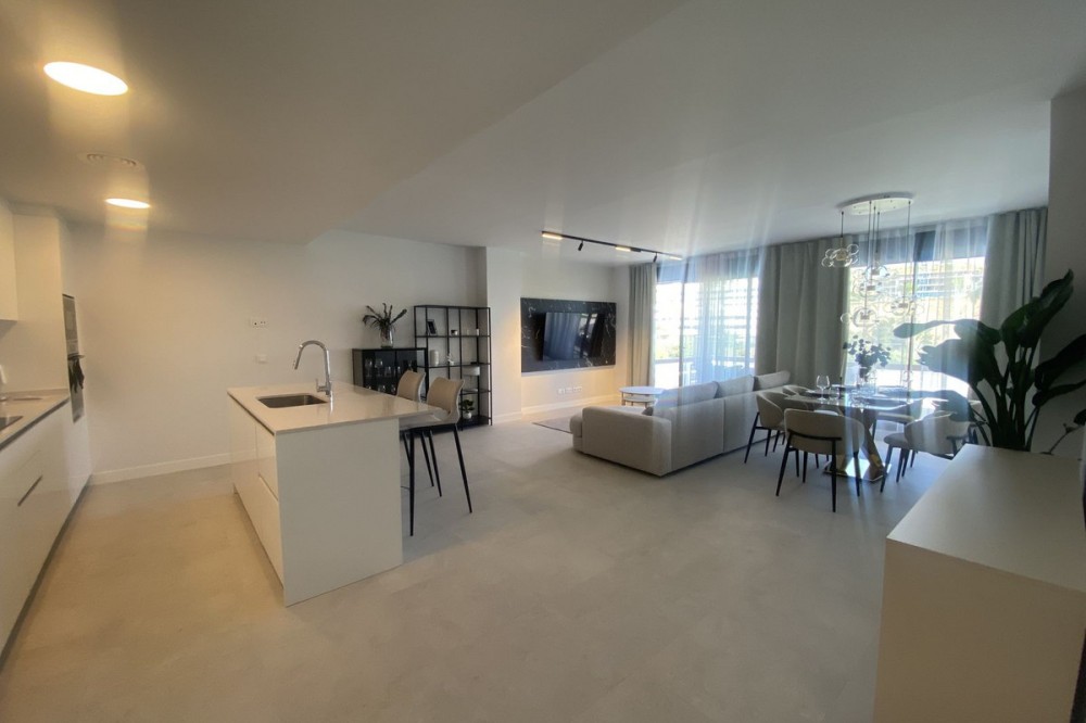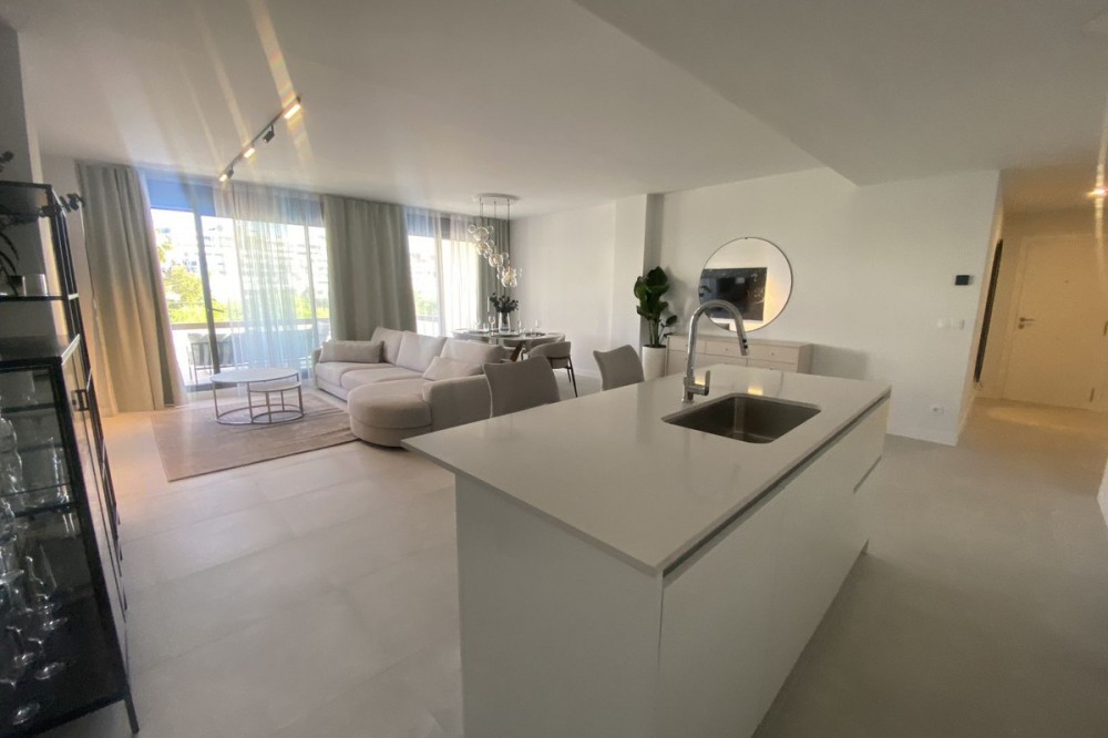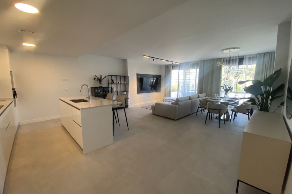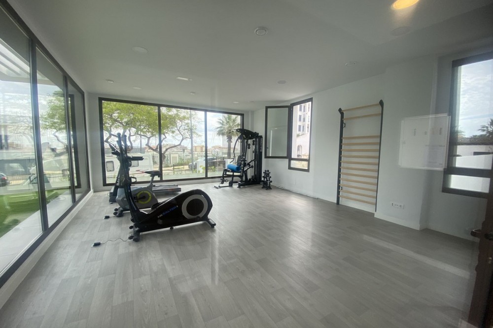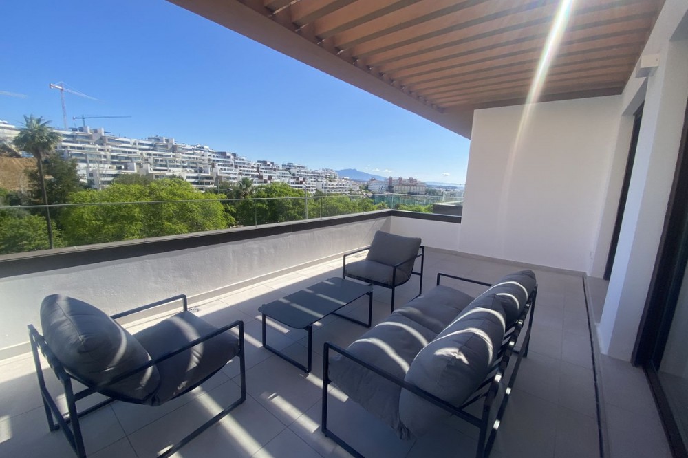 - Middle Floor Apartment, Estepona, Costa del Sol. 3 Bedrooms, 2 Bathrooms, Built 120 m², Terrace 20 m². Setting : Close To Shops, Close To Sea, Close To Schools. Orientation : East. Condition : Excellent. Pool : Communal. Climate Control : Air Conditioning. Views : Sea, Mountain, Urban. Features : Covered Terrace, Lift, Fitted Wardrobes, Near Transport, Private Terrace, Gym, Ensuite Bathroom, Access for people with reduced mobility, Double Glazing. Furniture : Fully Furnished. Kitchen : Fully Fitted. Garden : Communal. Parking : Underground.