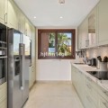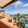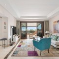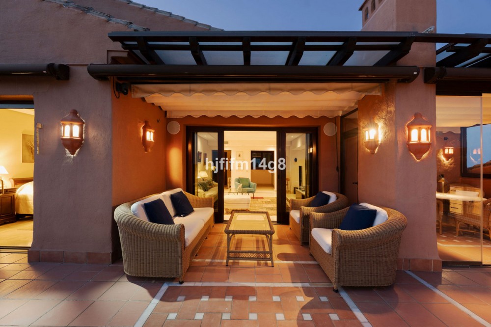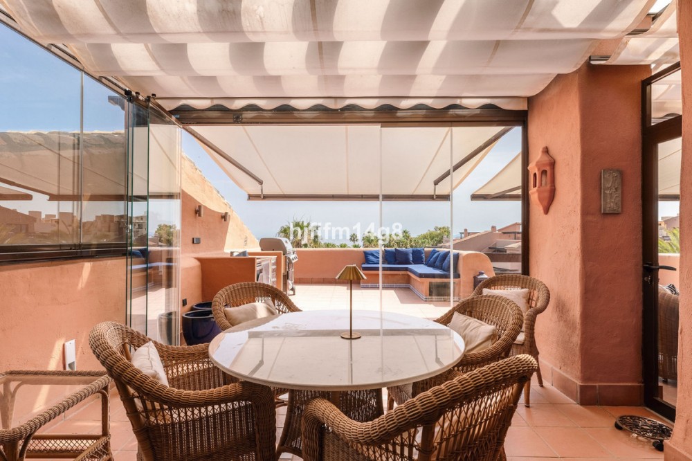 - This exceptional 3-bedroom penthouse in Mar Azul, Estepona, offers a luxurious coastal lifestyle, combining elegance, comfort, and breathtaking sea views. Located on the sought-after New Golden Mile, Mar Azul is a prestigious beachfront urbanization next to the renowned Kempinski Hotel. Residents enjoy direct beach access and are just minutes from high-end boutiques, cafés, and restaurants. The charming Estepona town centre is only a 5-minute drive away. Just ten-minutes walk to luxurious Laguna Beach with several restaurants. One of the standout features of this unique penthouse is that it is built entirely on one level, offering ease of living and a seamless flow throughout the home. The highlight is the unusually large southwest-facing terrace, accessible directly from the living room. This expansive outdoor space includes a lounge area, space for sunbeds, and a glazed corner dining area that can be opened or closed depending on the season — ideal for year-round use and entertaining. Additionally, the apartment and terrace are equipped with 8 integrated Sonos speakers, providing premium-quality sound throughout. Inside, the property welcomes you with a bright and spacious open-plan living and dining area, bathed in natural light through floor-to-ceiling glass doors. The refurbished modern, fully fitted kitchen is equipped with high-end appliances, offering both functionality and style. Underfloor heating and aircondition in all rooms. There are three generously sized bedrooms, one of them in-suite and the other two sharing one bathroom. Providing comfort and privacy for family and guests alike. Two of the bedrooms has directly access to separate outdoor space. Additional features include two underground garage spaces, ensuring secure parking and two store rooms. From the garage there is an elevator with direct access to the entrance of the apartment. Interior 112m2, plus terrace 72 m2. The community of Mar Azul offers resort-style amenities, including several outdoor swimming pools, an indoor heated pool, a fully equipped gym, spa, and sauna. The complex is gated with 24-hour security, ensuring peace of mind and an exclusive living environment. This remarkable penthouse, with its rare single-level layout, expansive terrace, and unbeatable southwest orientation, represents a rare opportunity to enjoy true beachfront luxury between Marbella and Estepona.