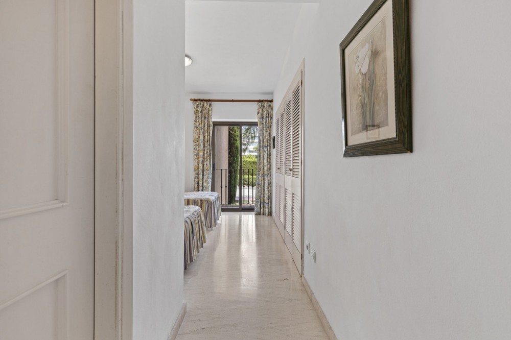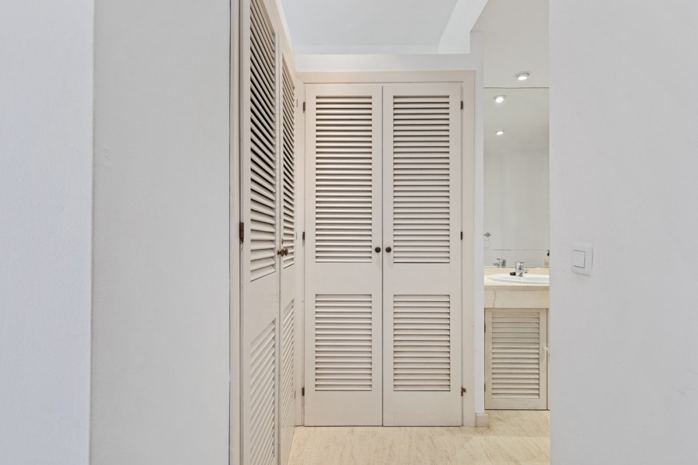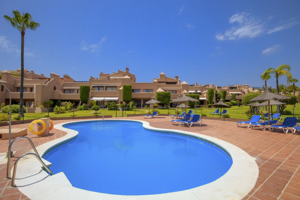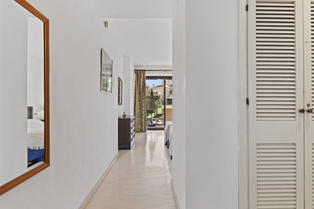 - Located within a very pleasant, secure residential community offering 24/7 security, this beautifully presented apartment combines comfort and resort-style amenities. Residents enjoy access to three swimming pools, tennis and paddle tennis courts, and beautifully maintained mature gardens. The apartment features two generously sized bedrooms, both with en-suite bathrooms and fitted wardrobes. The master bedroom opens onto a sunny, covered terrace that overlooks the communal gardens and pool—perfect for relaxing or entertaining. The second bedroom offers added charm with a Juliette terrace, allowing natural light and garden views to flood the space. Inside, the apartment is bright and inviting, with air conditioning throughout for year-round comfort. The spacious living area provides direct access to the terrace, garden, and pool area, enhancing the sense of indoor-outdoor living. An exterior awning offers shade on sunnier days, extending the use of the terrace. Additional features include communal parking, direct access to recreational facilities, and a sun-drenched layout that makes this apartment a true gem in one of the area’s most sought-after communities.