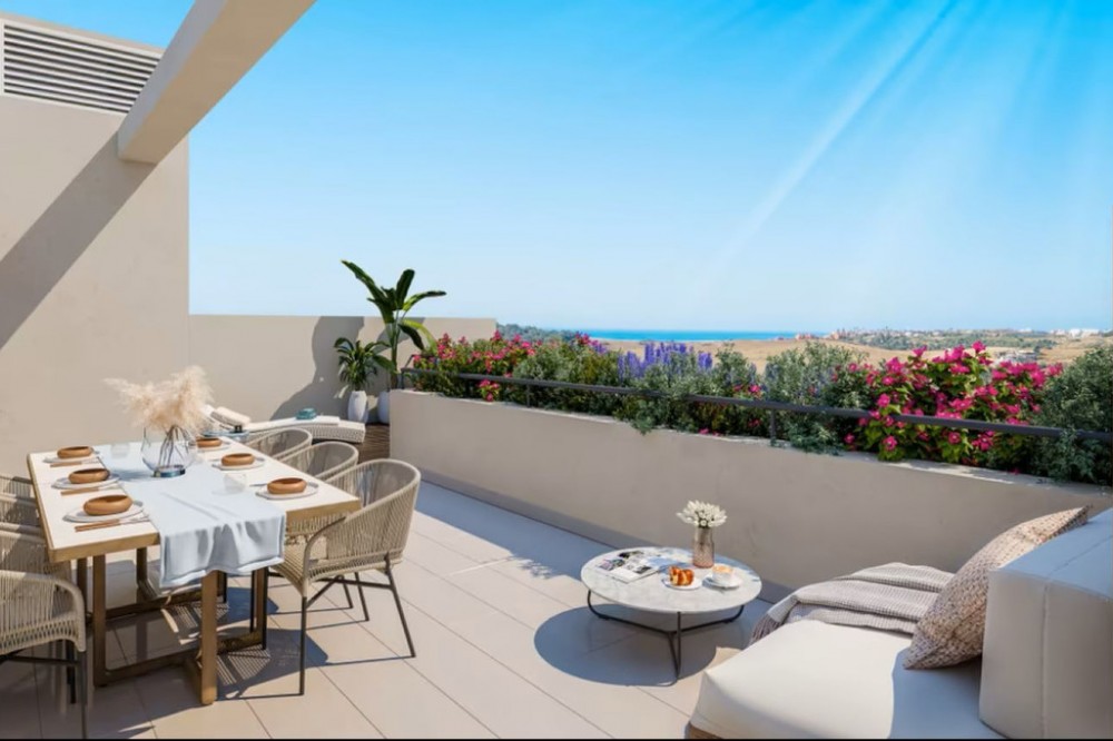 - Located in Estepona Golf surrounded by peaceful countryside and yet within just a short drive to the charming town of Estepona with its many sports and cultural facilities, wonderful sandy beaches and a vast array of restaurants and amenities. This brand new, modern two bedroom, two bathroom apartment boasts spectacular sea and golf views from its communal areas. Set within a secure gated community with large communal tropical gardens, two swimming pool areas, tennis and a large co-working space. Built to a high standard with open plan living and dining area leading onto its private terrace with partial sea and wonderful golf views. Fully fitted kitchen and two bedrooms with fitted wardrobes, of which the master bedroom boasts an en-suite bathroom. Hot and cold air-conditioning throughout, underground parking and storage unit also included. Wonderful opportunity for permanent living, holiday use or investment for rentals.