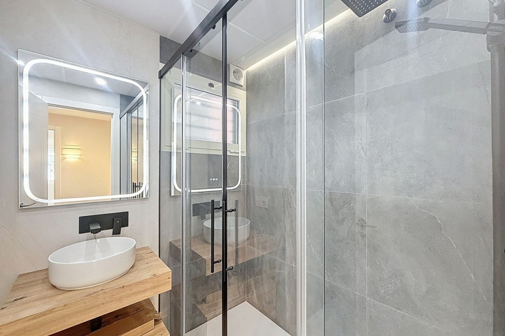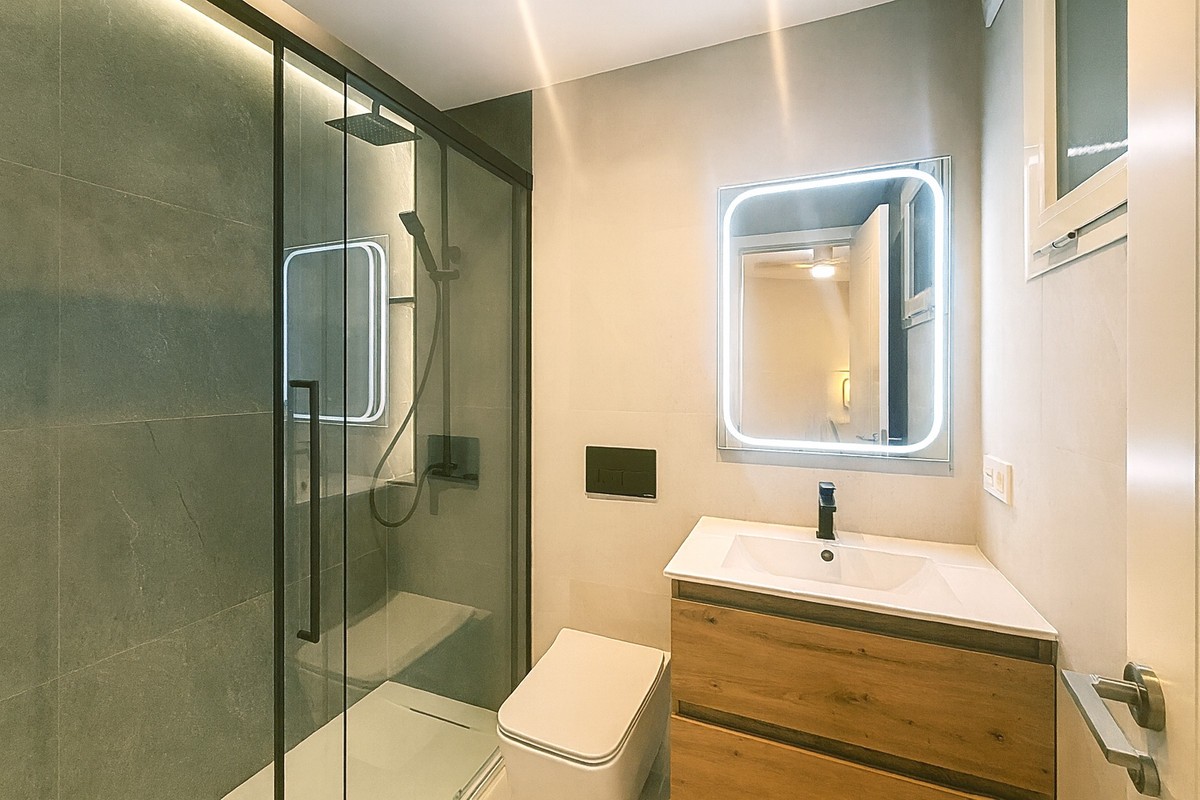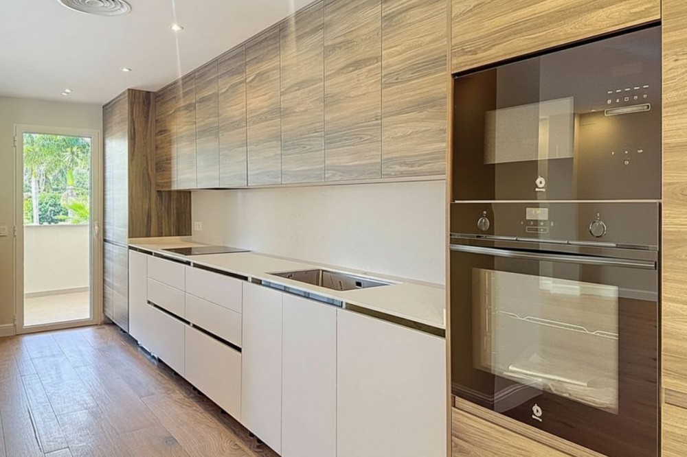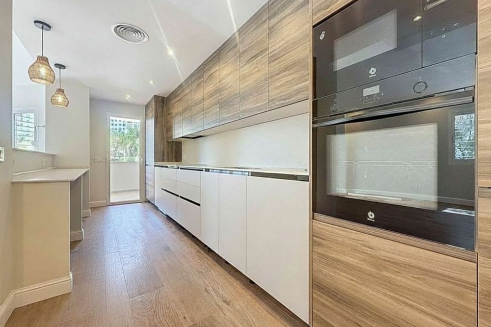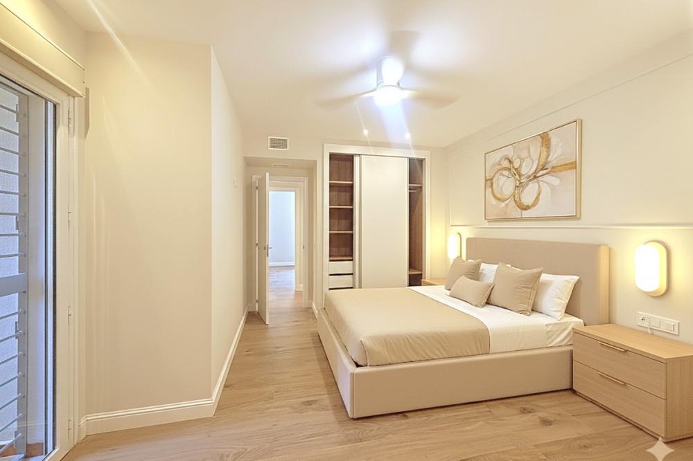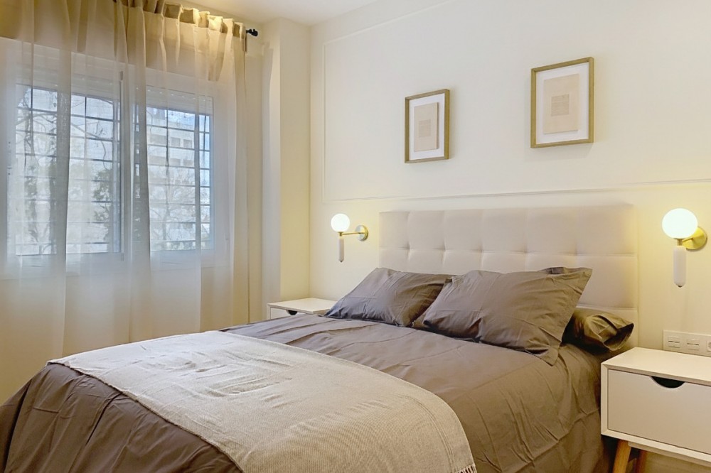 • Spectacular 120 m² apartment, recently renovated with high-quality materials and finishes. The property is delivered fully furnished and ready to move in, decorated with exclusive furniture and equipped with top-of-the-line appliances, offering a modern, functional, and comfortable style in one of Estepona’s most sought-after areas. Strategically located between the Marina and the historic center, this apartment combines proximity to the beach, restaurants, shops, schools, and all kinds of services, making it an ideal option both as a primary residence, a second home, or a high-demand investment. The interior layout includes a spacious and bright living room with direct access to a cozy private terrace of 7 m² with open views. The designer kitchen, fully equipped and with integrated laundry area, offers a practical and elegant space, connected to the terrace and open to the living room through a large peninsula. The apartment features three spacious bedrooms, all with new, lined, and illuminated built-in wardrobes, as well as ceiling fans and a powerful air conditioning system (8,000 frigories) that ensures maximum comfort throughout the year. The master bedroom has an en-suite bathroom with a modern shower and access to a balcony overlooking the interior of the complex, while the other two bedrooms—one currently used as a dressing room—share a second full bathroom. Both bathrooms stand out for their complete renovation with top-quality finishes, each featuring exterior windows that provide perfect ventilation. They include sliding glass shower screens designed to offer greater comfort and elegance. The property includes a parking space in the complex’s underground garage. Communal areas feature a swimming pool, well-maintained gardens, a children’s playground, and an elevator, offering all the amenities necessary to enjoy the Mediterranean lifestyle. This is a unique and exclusive property: a fully renovated and furnished apartment, with brand-new furniture, high efficiency, and in a privileged location, just a 1-minute walk from the marina and the beach, and 5 minutes from Estepona’s old town.