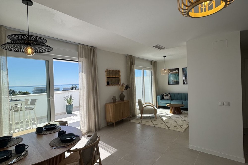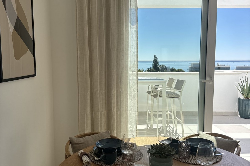 - This TOP FLOOR penthouse is located in a newly build development Celere Sea View in Estepona (Malaga), located in a newly developing built-up area, only 5 minutes from the town centre and the Estepona Marina. This location offers many leisure and service opportunities. Right next to the development you will find your daily supermarkets, as well as restaurants, school, sport center, the Estepona High Resolution Hospital all surrounded by several golf courses within a 5km radius, including Doña Julia Golf, Finca Cortesín Golf Club, Estepona Golf and Valle Romano Golf. This area is developing rapidly and has the potential to increase prices. This development is newly built, completed in November 2024. It consists of 3 intimate blocks of flats, ideally located; there are two supermarkets, a pharmacy and two restaurants right next to it and the beach is 300 meters away. The complex has a swimming pool, relaxation area and gym. The apartment is located on the top floor and has fantastic panoramic sea views from the terrace. The price includes a parking place in the underground garage and a storage room. This property meets all the conditions for short or long-term rental and is an ideal opportunity to invest funds.