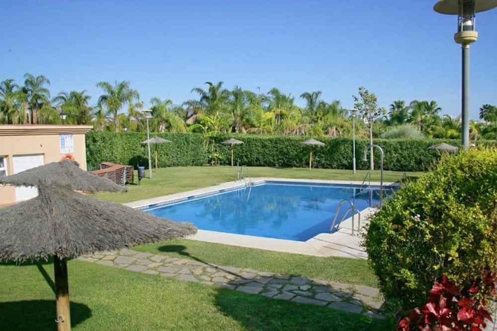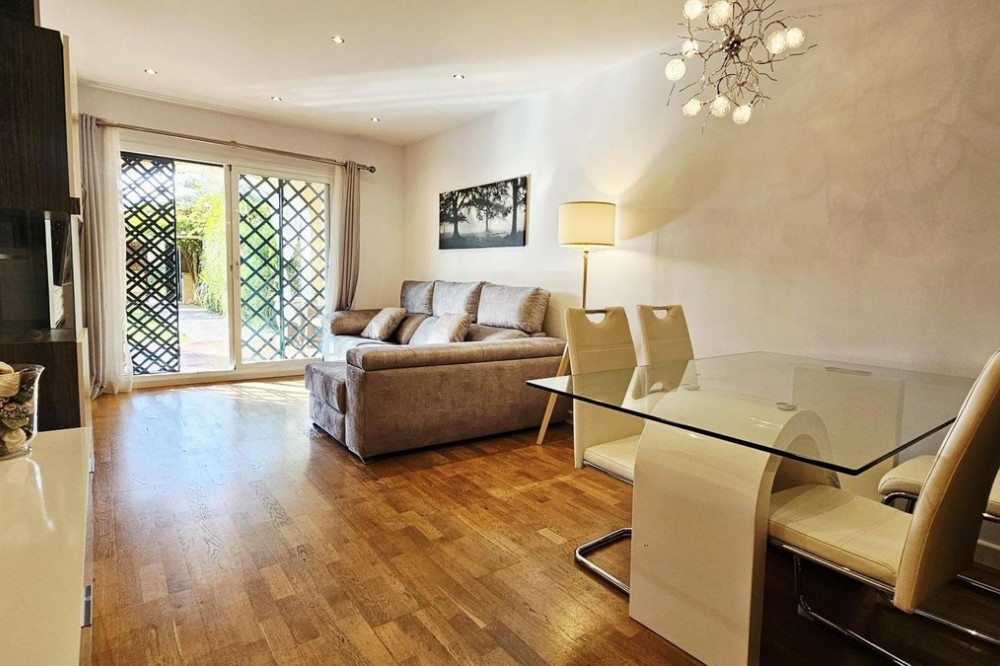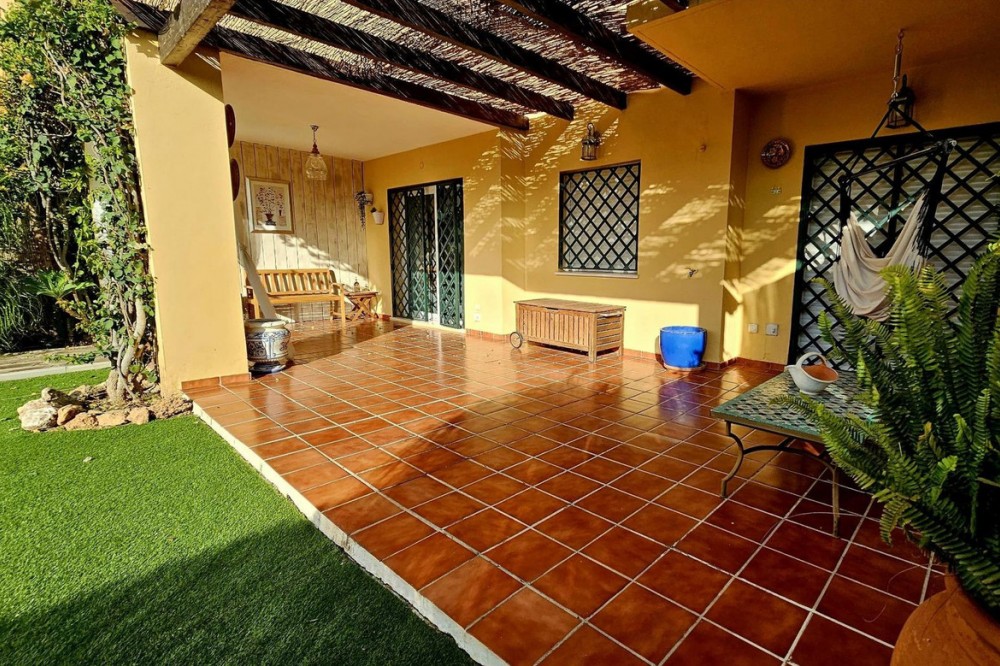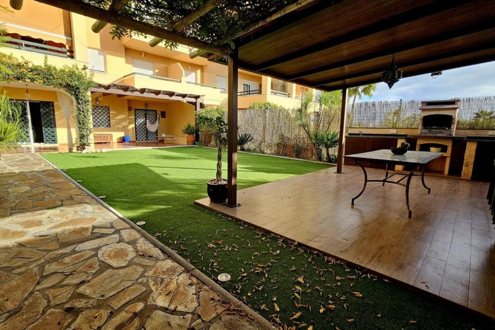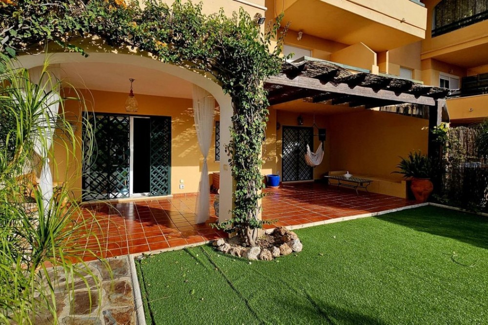 - This beautiful two-bedroom ground-floor apartment boasts a spacious outdoor area. It features a large covered terrace and a spacious private garden with a barbecue, pergola, and direct access to the swimming pool, paddle tennis court, and children's playground. The porch has a pergola, perfect for relaxing or gathering outdoors. The entire garden is paved and covered with high-quality artificial turf, making maintenance easy and ensuring it looks its best year-round. A barbecue area has also been created, equipped with custom-made furniture, a sink, water and electricity connections, and a second pergola that provides shade and comfort, creating an ideal space for meals and outdoor gatherings. Thanks to these improvements, the garden is a practical, comfortable, and modern space, perfect for enjoying time with friends and family. The apartment is located in the prestigious Selwo area, on Estepona's New Golden Mile, near Resina Golf, the new Padel Club, and the American School. Its south-facing orientation guarantees natural light throughout the day. This apartment features two bathrooms, one of which is en-suite with a dressing room and direct access to the terrace and garden; an extended kitchen with a laundry area and access to another terrace; and a bright living-dining room with access to the outdoor areas. It includes hot/cold air conditioning throughout, an underground parking space with direct elevator access to the apartment door, and additional outdoor parking for guests. The community, comprised of only 32 apartments, offers a large swimming pool, a children's playground, and a paddle tennis court. Its excellent location, less than 10 minutes from San Pedro Alcántara and Estepona, and very close to Marbella and Puerto Banús, makes this property a unique opportunity. Thanks to its wonderful outdoor spaces and the area's pleasant climate, it feels like home. A viewing is highly recommended.