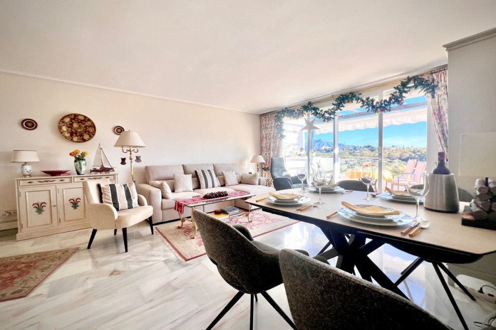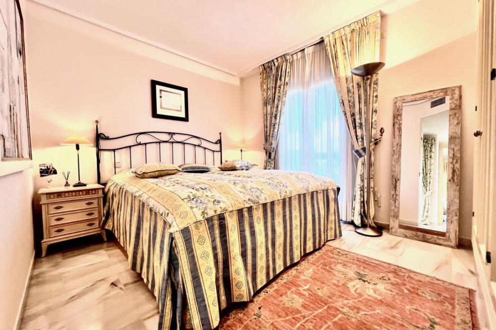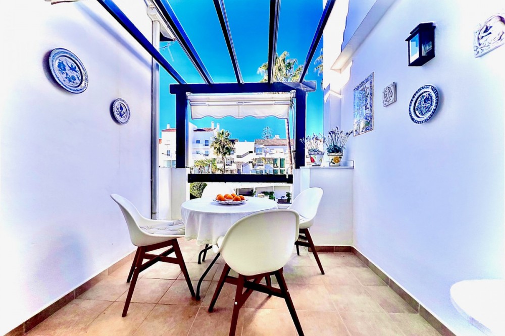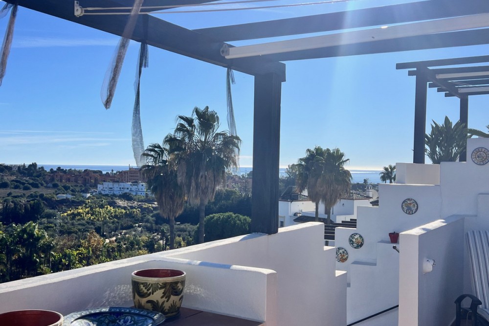 - Imagine waking up to the soft light of the Mediterranean streaming through the large windows of your living room. The best place to enjoy breakfast is outside on one of the three spacious terraces, which cover a total of approx. 90 square metres, while you take in the sea view and the tranquillity of the well-maintained Las Jacarandas residential complex in Bel Air. Whether you prefer sun or shade, there is always a place to suit the moment. The flat itself is ready to move into and exudes elegance. The spacious living room with marble flooring forms the heart of the apartment and leads directly onto the terraces. There are two bedrooms and two bathrooms, one of which is en suite. The bedrooms have built-in wardrobes. Everything is perfectly maintained and fitted with timeless materials, including lots of marble in the bathrooms with spacious showers. A particular highlight is the roof terrace with a storage room measuring approximately 30 square metres. This can easily be converted into an additional bedroom with shower, a studio or even a private sauna. From the underground car park, the lift takes you directly to the third floor - guaranteeing everyday convenience. The complex itself is excellently maintained and offers two beautiful swimming pools surrounded by well-tended gardens - a place where peace and relaxation take centre stage. The flat is sold fully furnished, so you can move in immediately. The location is ideal: officially, the complex belongs to Estepona, but in fact it is located exactly halfway between Marbella and Estepona, close to San Pedro de Alcantara. This allows you to enjoy the tranquillity of Estepona and at the same time be close to the liveliness of Marbella. In just 10 minutes you can reach the world-famous Puerto Banus marina with its luxury boutiques, exclusive restaurants and nightlife. Malaga Airport is only 65 km away, less than 45 minutes by car. The nearest beach, Playa Saladillo, is only 1 km away and offers charming beach bars for a meal or a drink. Supermarkets and shops are just a 5-minute walk away. There are 2 children's playgrounds and sports facilities in the immediate vicinity, as well as several golf courses - ideal for families or anyone who enjoys an active lifestyle. Estepona itself has become one of the most sought-after locations on the Costa del Sol in recent years. The historic old town with its flower-filled streets, the kilometre-long beach promenade, the lively harbour and the wide range of restaurants and cultural activities attract both international residents and visitors. Here, Andalusian charm combines with the comforts of a modern coastal town – and that is precisely what makes life here so desirable. This flat in Las Jacarandas is therefore more than just a home: it is an invitation to live the Costa del Sol lifestyle – with sea views, space, comfort and everything that makes the Spanish way of life so irresistible.