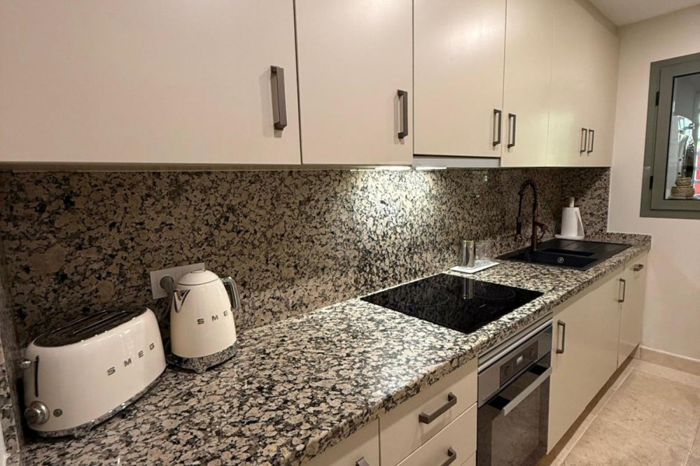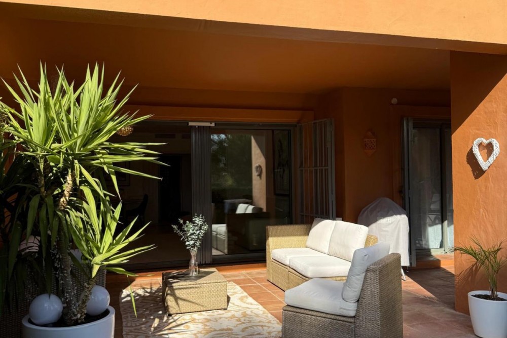 - Presenting an elegant, recently built apartment located in the prestigious Benatalaya development, in the eastern area of Estepona, Málaga. Boasting a privileged frontline golf location and surrounded by all necessary amenities, this property stands out for its comfort and excellent connectivity to public transport as well as the main commercial, educational, and leisure areas of the city. The apartment, with a built area of 140 m² (99 m² of interior space and 41 m² of a spacious private terrace), offers 2 bedrooms and 2 full bathrooms. The interior is characterized by its brightness and functional layout, featuring a spacious living room, fully equipped kitchen, built-in wardrobes, and high-quality finishes such as double-glazed windows and electric shutters. Residents enjoy an array of extraordinary amenities within a gated and secure community, including outdoor and indoor communal swimming pools, gym, sauna, jacuzzi, mature landscaped gardens, and a nearby children's playground. The entrance is equipped with a concierge, elevator, and adapted access, as well as communal garage and storage room. Security is ensured through 24-hour surveillance and assistance, as well as an access control system. This property represents an excellent opportunity for those seeking a high quality of life next to the golf course, surrounded by well-maintained gardens and a tranquil atmosphere, without sacrificing proximity to restaurants, schools, and shops. Its excellent condition, golf and garden views, and location close to all amenities make this apartment an ideal option both as a permanent residence and as an investment.