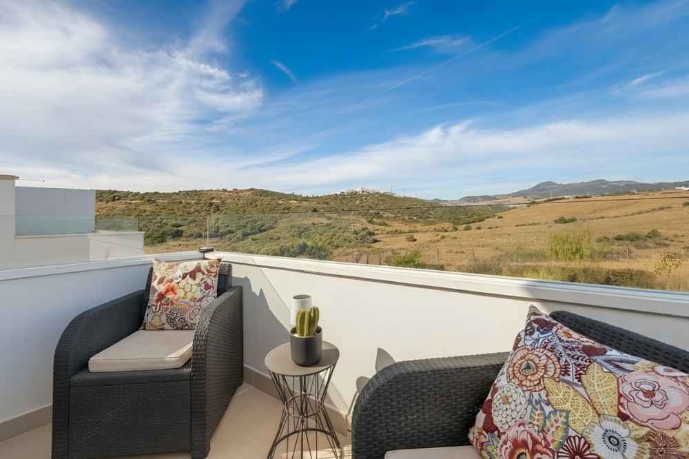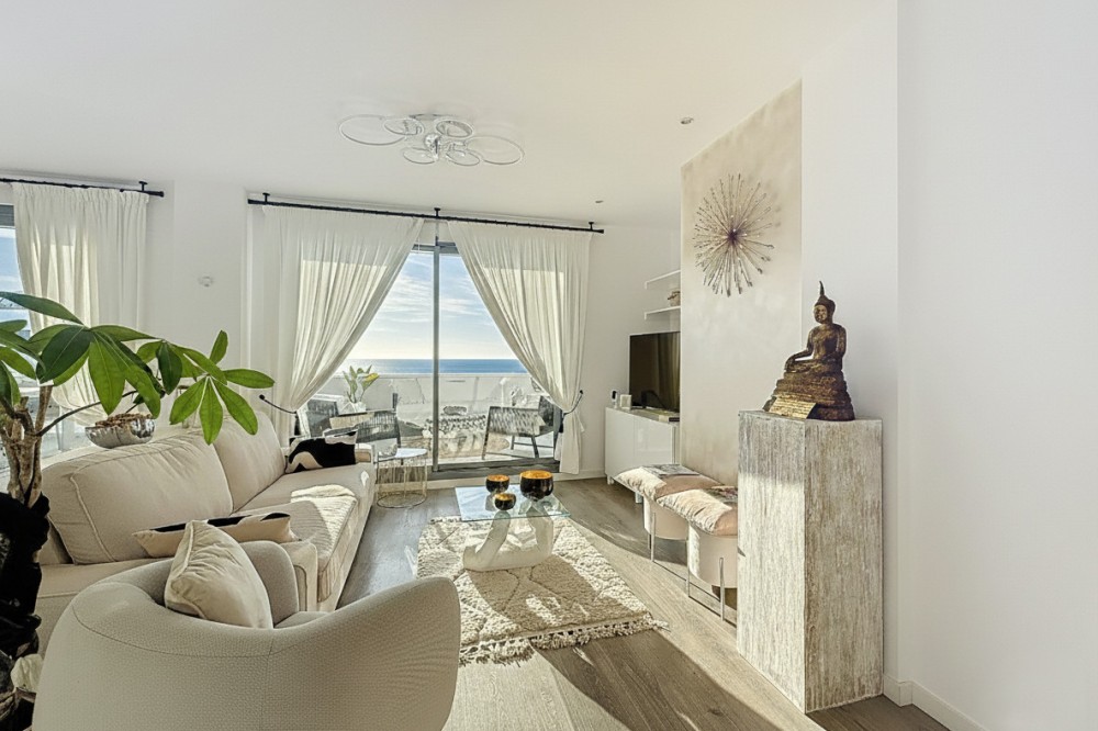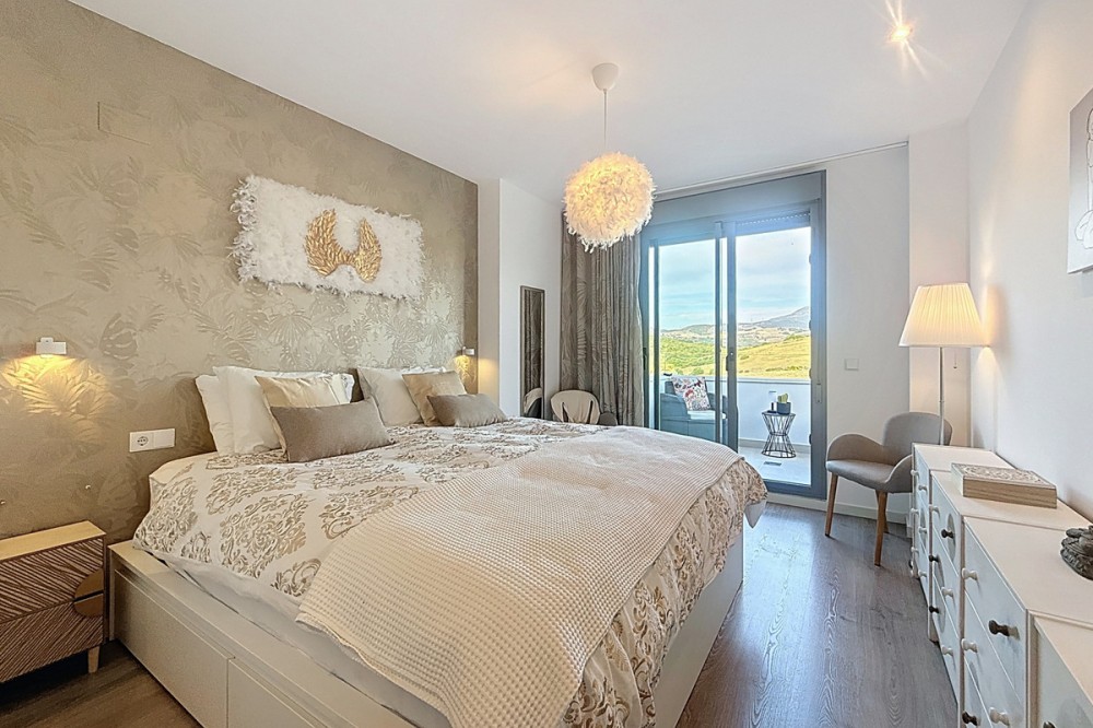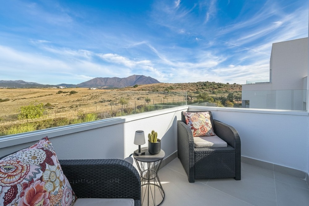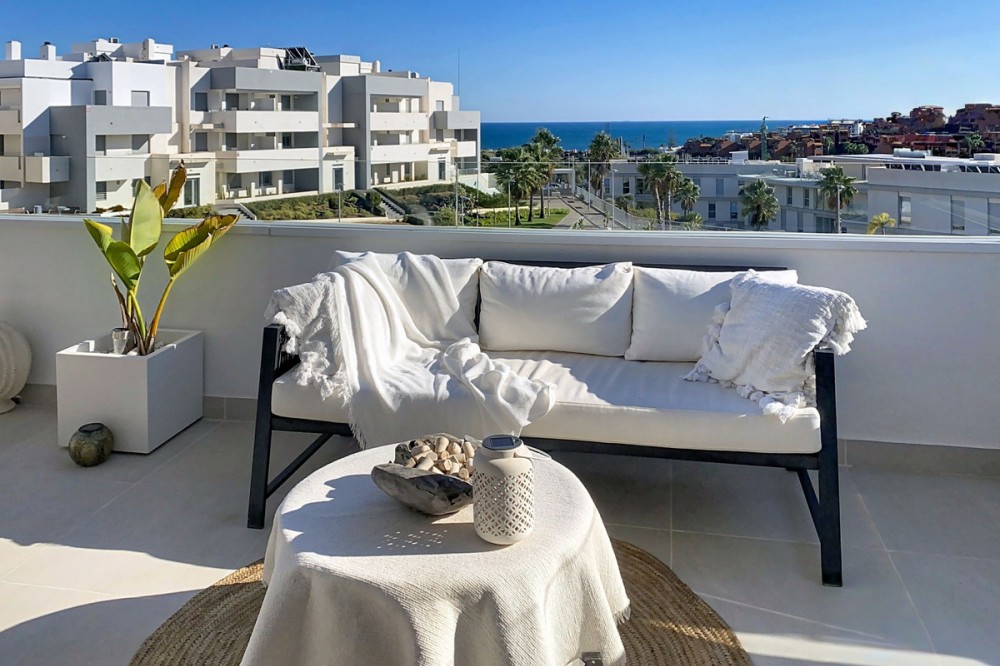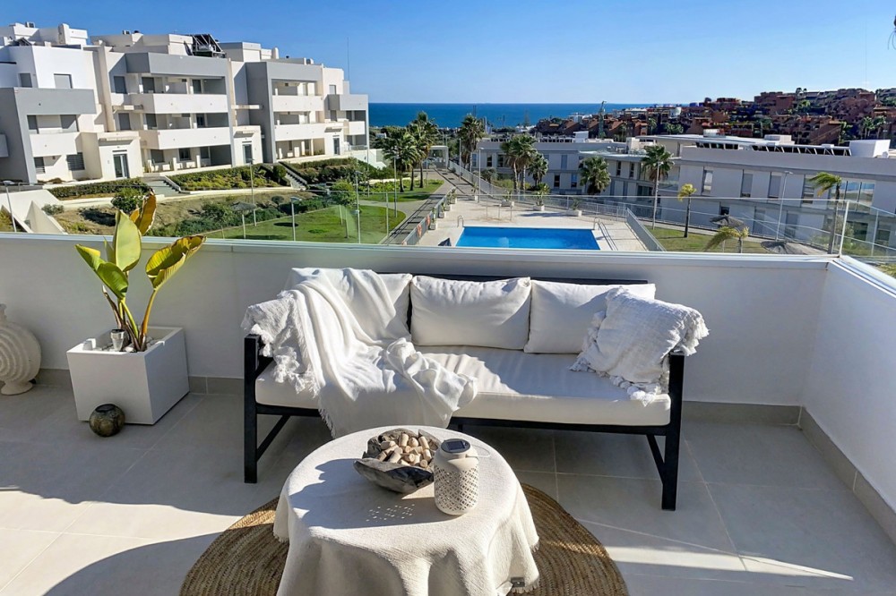 - This duplex penthouse is located in the Serenity Views Urbanization, in West Estepona, and stands out for its impressive sea views and spaciousness. The property, situated in a gated community, offers the tranquility of living close to the sea and the convenience of being near golf courses, shops, restaurants, and schools. The home features a spacious main living room, designed with an open-concept layout, which integrates perfectly with the private terrace, allowing you to enjoy natural light and direct panoramic sea views. The kitchen, fully equipped and modern in style, is connected to the living room and includes high-quality appliances, as well as a practical laundry area. In the sleeping area, there are two bedrooms with built-in wardrobes and two full bathrooms, one of them en suite. The bedrooms are designed to offer comfort and privacy, and the master bedroom also has a private bathroom and a private terrace with views of the countryside and mountains. An elegant staircase leads to the solarium, where the sense of spaciousness and the breathtaking sea views are truly impressive. Among the extras offered by this duplex penthouse are air conditioning, double glazing, reinforced door, as well as a garage and storage room included. The complex features a swimming pool and mature communal gardens, and elevator. The property is in excellent condition and has close access to all amenities, including the port, city center, and the beach.