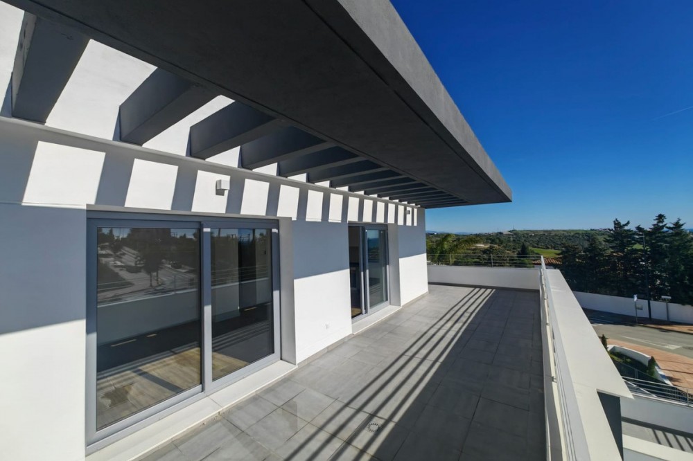 - Brand New South-Facing Penthouse with Panoramic Sea & Mountain Views – Habitat Valle Romano Discover this stunning, brand new penthouse located in the contemporary development of Habitat Valle Romano, set within the prestigious Valle Romano Golf Estate. Designed for modern Mediterranean living, this spacious property offers an exceptional blend of comfort, style, and lifestyle amenities. The penthouse features two generous bedrooms and two bathrooms, including a master suite with en-suite bathroom, finished to a high standard throughout. The bright open-plan kitchen, dining, and living area flows seamlessly onto an impressive south-facing L-shaped terrace, ideal for outdoor dining, entertaining, or simply relaxing while enjoying panoramic views of the Costa del Sol coastline, surrounding mountains, and the Mediterranean Sea. Residents benefit from a secure and private environment, with underground parking and a storage room included. The development offers outstanding communal facilities, including a large outdoor swimming pool, fully equipped gym, communal work and entertainment space with a fitted kitchen, outdoor fitness circuit with exercise machines, chill-out areas, and a pétanque court—all designed to enhance everyday living. Valle Romano enjoys a privileged location, just 10 minutes by car from Estepona Old Town, the marina, beaches, and all local amenities, while being surrounded by nature and golf. This penthouse is ideal as a family holiday home, a full-time residence, or a high-potential investment property in one of Estepona’s most up-and-coming areas