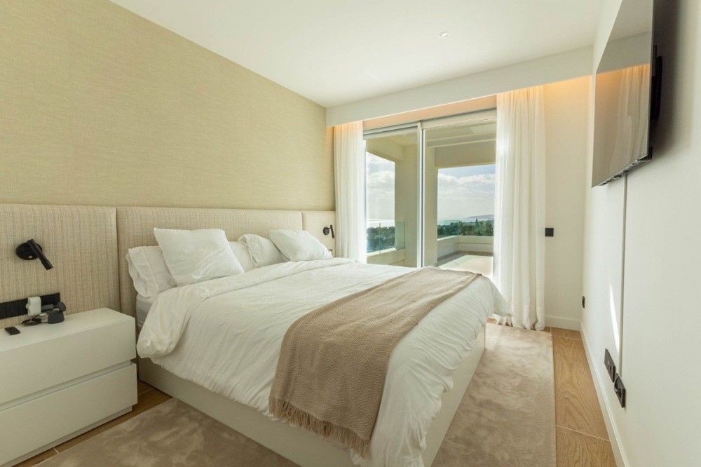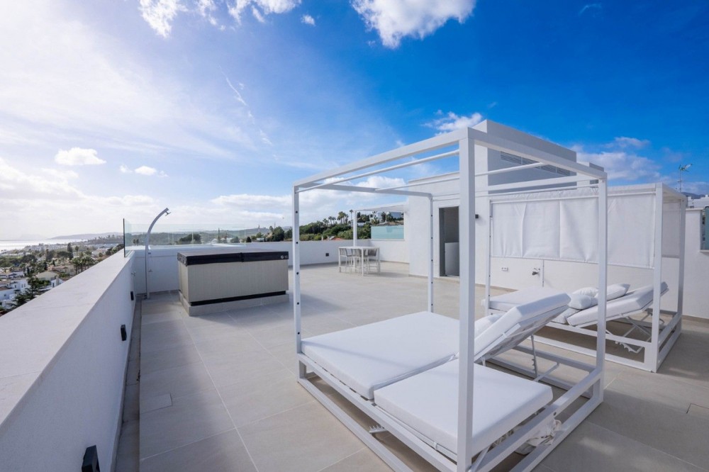 - Luxury corner, South,-South West Facing 3-Bedroom corner Penthouse with Solarium & Jacuzzi – Estepona..Panoramic views from solarium. Exceptional corner, luxury penthouse located within a secure gated community in Estepona, offered fully furnished with brand-new luxury furniture and ready for immediate occupation — no expense spared, move straight in.. The property enjoys 180° sea views from the lounge and spectacular 380° panoramic views from the private solarium, which features a jacuzzi and ample space for outdoor living and entertaining. Situated just 500 metres from the beach, the penthouse combines privacy, comfort, and an exceptional coastal lifestyle. The apartment offers 114.65 m² of interior living space, complemented by a 67.30 m² terrace and an impressive 108.15 m² solarium. Finished to the highest standard, it includes underfloor heating throughout and €40,000 worth of upgraded packages included directly from the developer. Residents benefit from resort-style communal facilities, including a fully equipped luxury gym, sauna, and outdoor swimming pools with open sea views, all set within beautifully landscaped communal areas. Ideally located, Estepona’s vibrant city centre is just 2 km away and easily accessible on foot, while excellent road connections place Marbella only 20 minutes away, Sotogrande 20 minutes, and Málaga International Airport approximately 40 minutes away. Property features: 3 bedrooms West-facing 180° sea views from lounge 380° panoramic views from solarium Private solarium with jacuzzi Brand-new luxury furniture included Underfloor heating throughout Gated community 500 m to the beach Additional features: 2 underground garage spaces (12.50 m² each) 1 storage room (7.90 m²) A rare opportunity to acquire a turnkey luxury penthouse in one of Estepona’s most desirable residential areas.