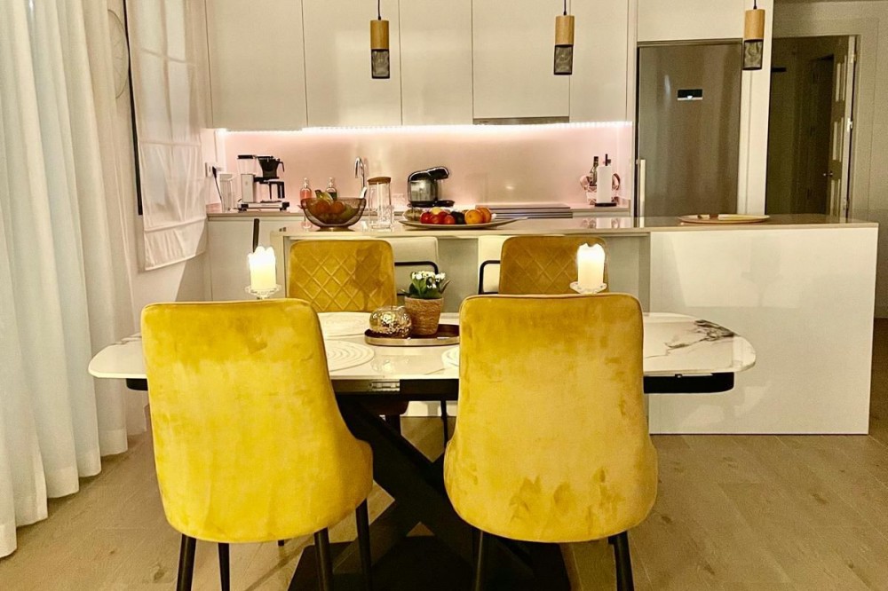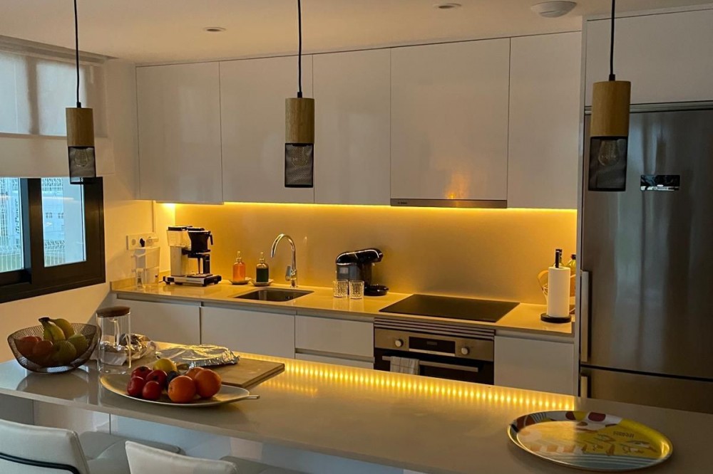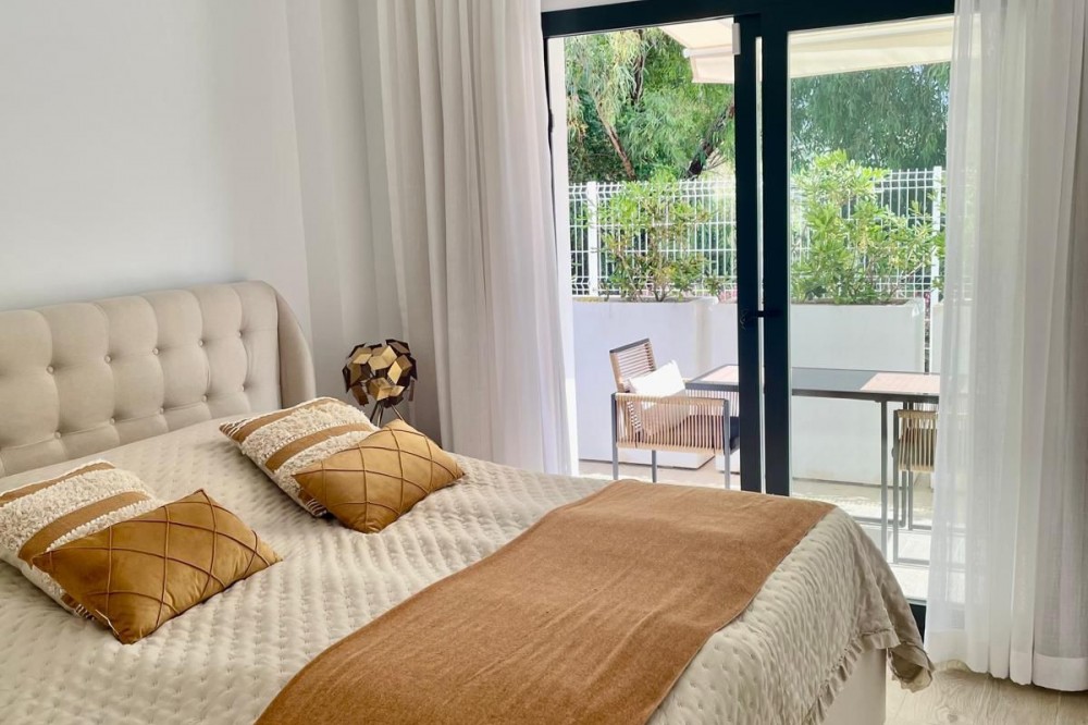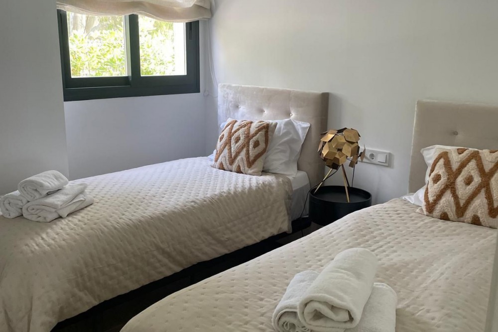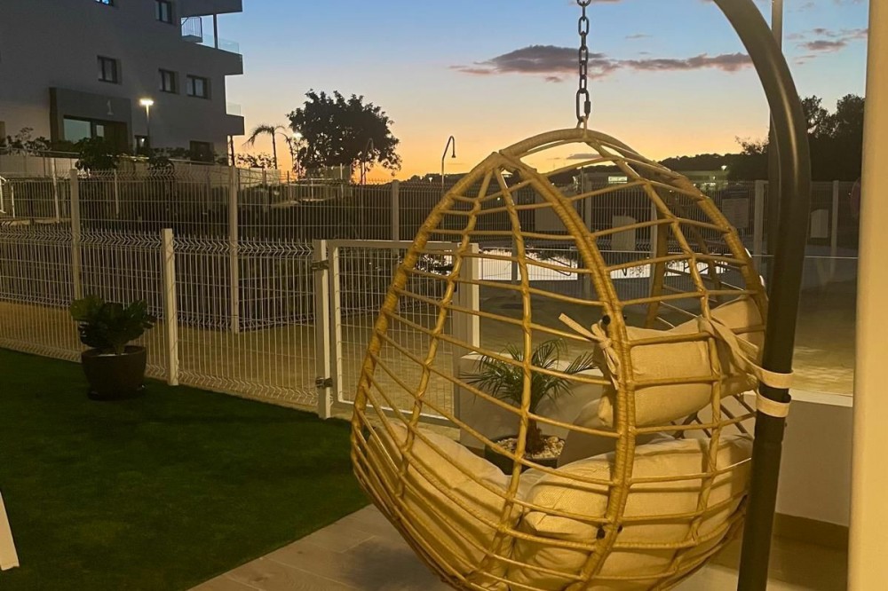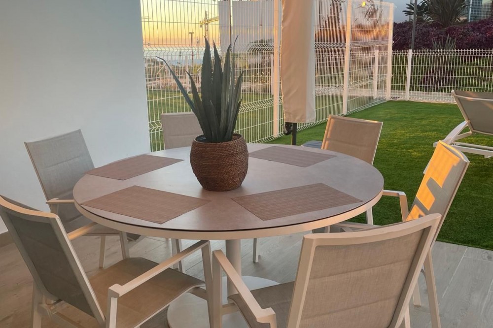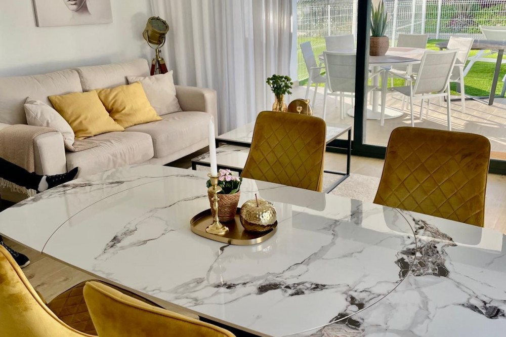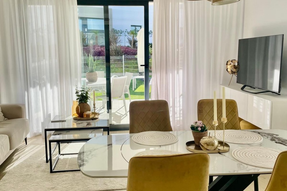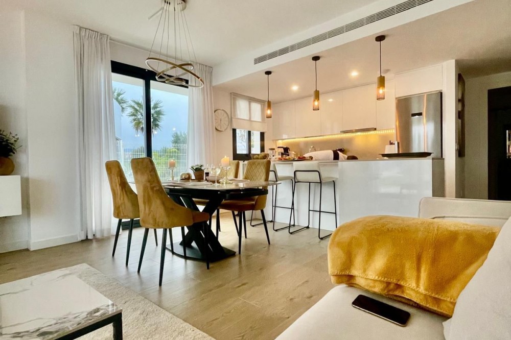 - Excellent ground floor corner apartment with a good layout in a recently built complex. The property has two bedrooms and two bathrooms, a living room with an open-plan kitchen and a large central island. The living room and kitchen have large sliding doors facing south and west. The living room leads directly to the terrace and a private south-facing patio with artificial grass and partial sea views. The bedrooms are located on the north side of the building, providing greater tranquility. The master bedroom has direct access to the terrace. The terrace surrounds the property on the south, west, and north sides, allowing for different outdoor areas. South-facing with partial sea views, west-facing with mountain and pool views, and north-facing with mountain views. Includes parking space and storage room. Don't hesitate to request a visit!