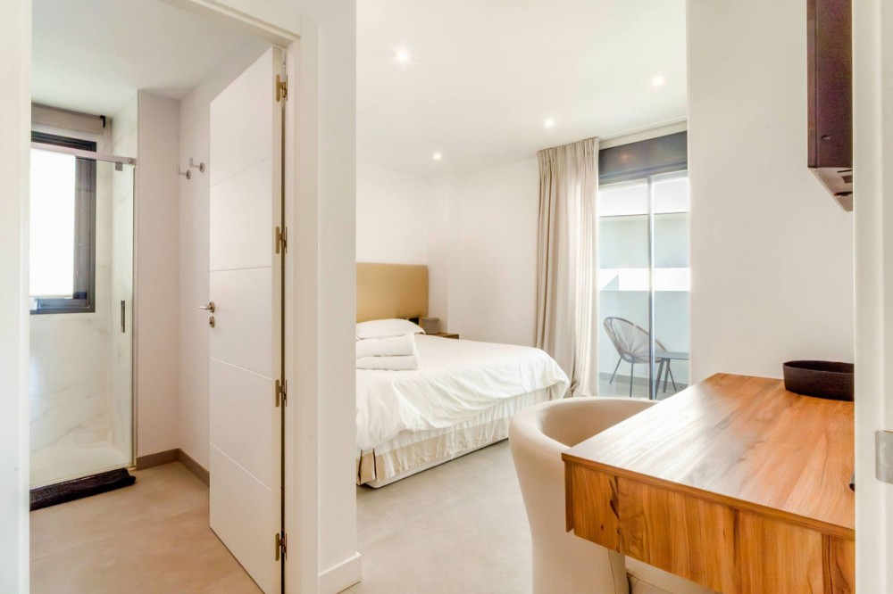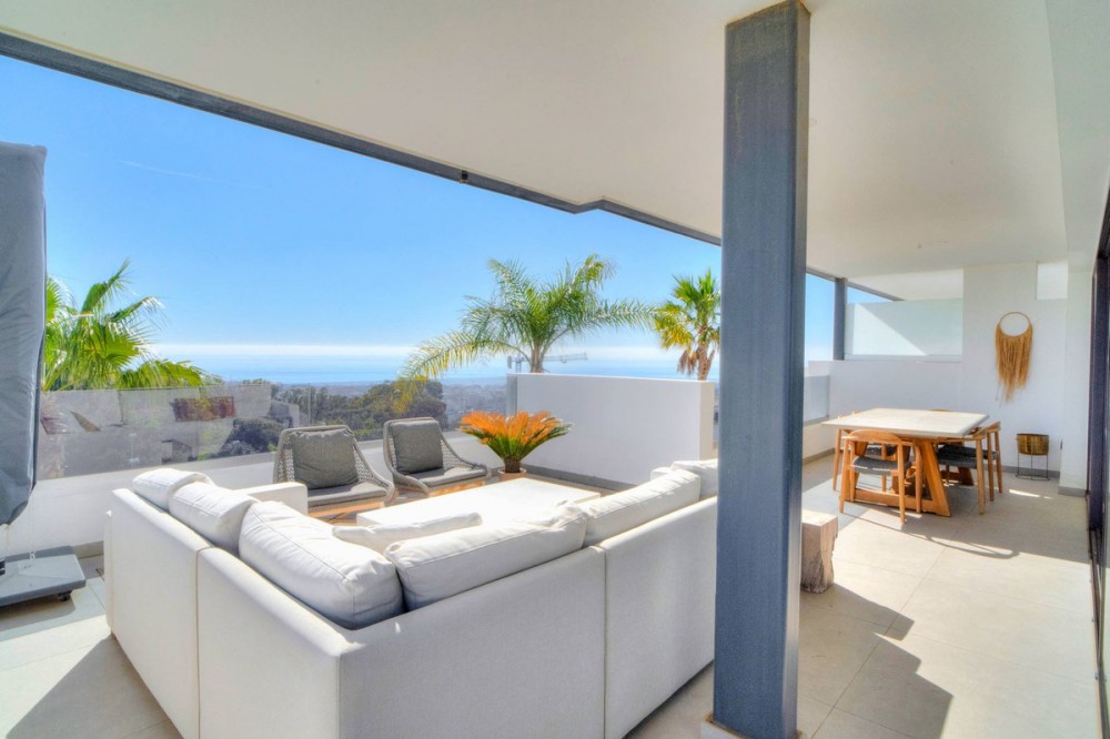 - Exceptional sought-after contemporary duplex penthouse for sale in Mirador de Estepona Hills, Estepona Apartment details * Spectacular, huge penthouse with 4 bedrooms which is very rare * Very modern, contemporary architecture * Top of the range appliances * Duplex distribution * South / South-East orientation * Spectacular panoramic 270º sea and mountain views, views over the entire urbanization * Very generous open plan kitchen, dining and living room with floor to ceiling windows * The kitchen is fully equipped with top brand appliances, there is a large associated utility room * Fitted wardrobes in all bedrooms * Air conditioning for cooling and heating * Private underground parking slot for 2 cars Complex details: * Superb new luxury village-complex just north of the centre of Estepona (walking distance via a dedicated path) * Gated, with 24h dedicated manned security + security cameras * Impressive tropical gardens, walkways with 2 swimming pools * Blue Duck cocktail bar and restaurant in the center of the urbanization near one of the pools 2600 sqm of sports zone, comprising a huge state-of-the-art gym of 1000 sqm, 5 padel tennis courts, 1 tennis court * Kids playground * Charging points for electric vehicles