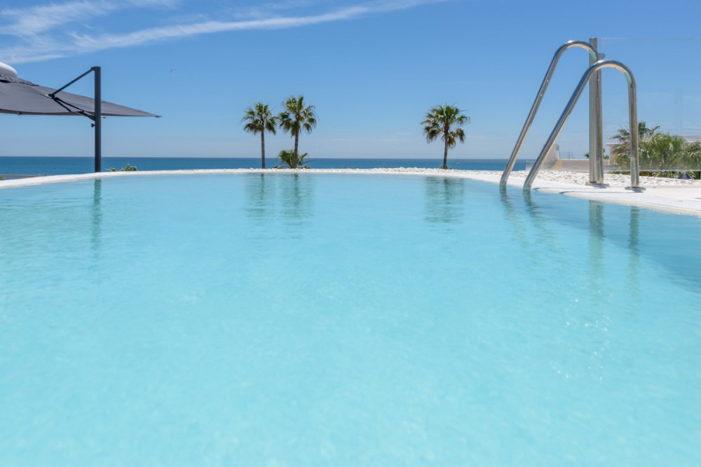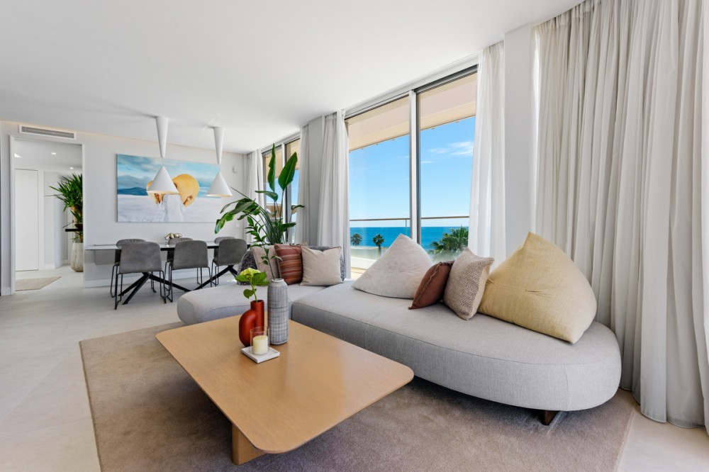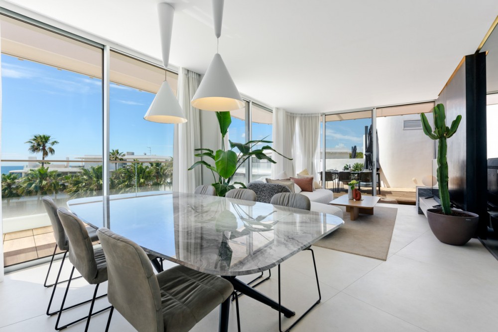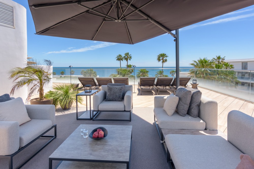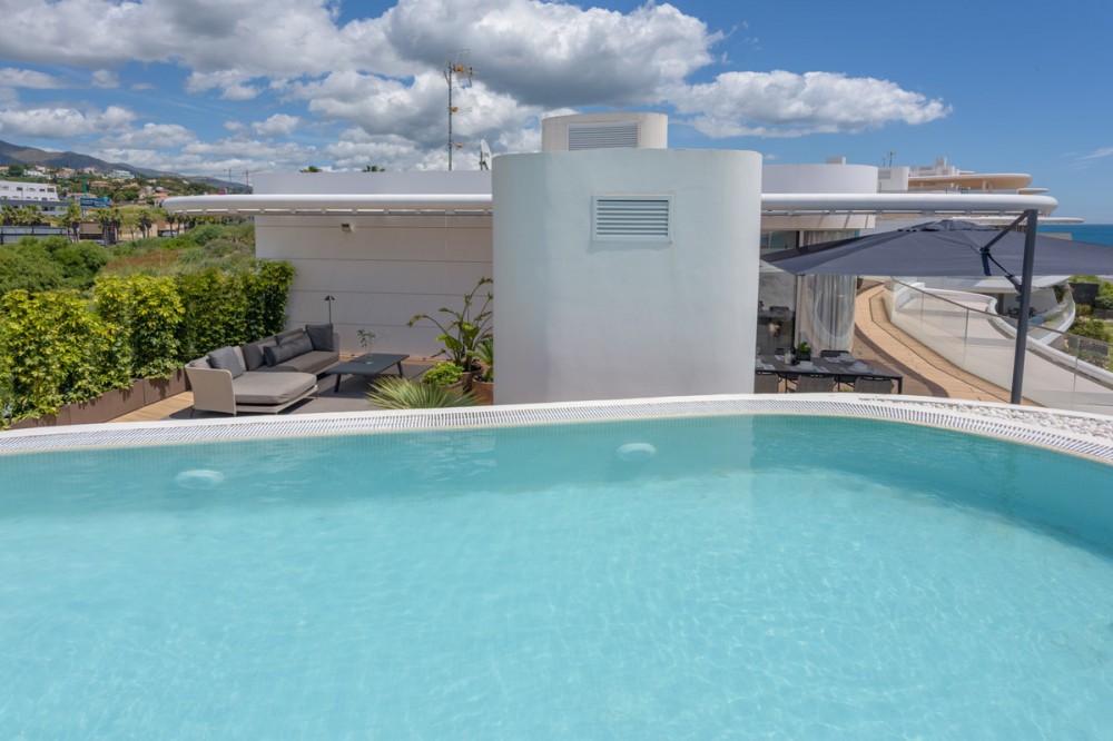 - A three-bedroom penthouse located in one of Estepona’s most prestigious frontline beach developments, offering uninterrupted Mediterranean views and contemporary coastal living. The apartment is defined by expansive terraces designed for both relaxation and entertaining, featuring a private plunge pool and open sea views that extend along the coastline. Floor-to-ceiling glazing floods the interior with natural light and creates a seamless connection between indoor and outdoor spaces. The open-plan kitchen is fully fitted with Gaggenau appliances, combining minimalist design with professional-grade performance. Living and dining areas are generously proportioned and oriented to maximise the outlook. Accommodation comprises three bedrooms, including a principal suite with direct terrace access and sea views. Bathrooms are finished to a high standard, complementing the clean, modern aesthetic throughout. Additional features include underfloor heating, air conditioning, multiple parking spaces, private plunge pool, full spa facilities on site, outdoor and indoor swimming pools, and a superlative frontline beach location. A rare opportunity to acquire a frontline penthouse in a landmark modern development, combining privacy, lifestyle amenities, and exceptional coastal views—ideal as a high-end second home or long-term investment.