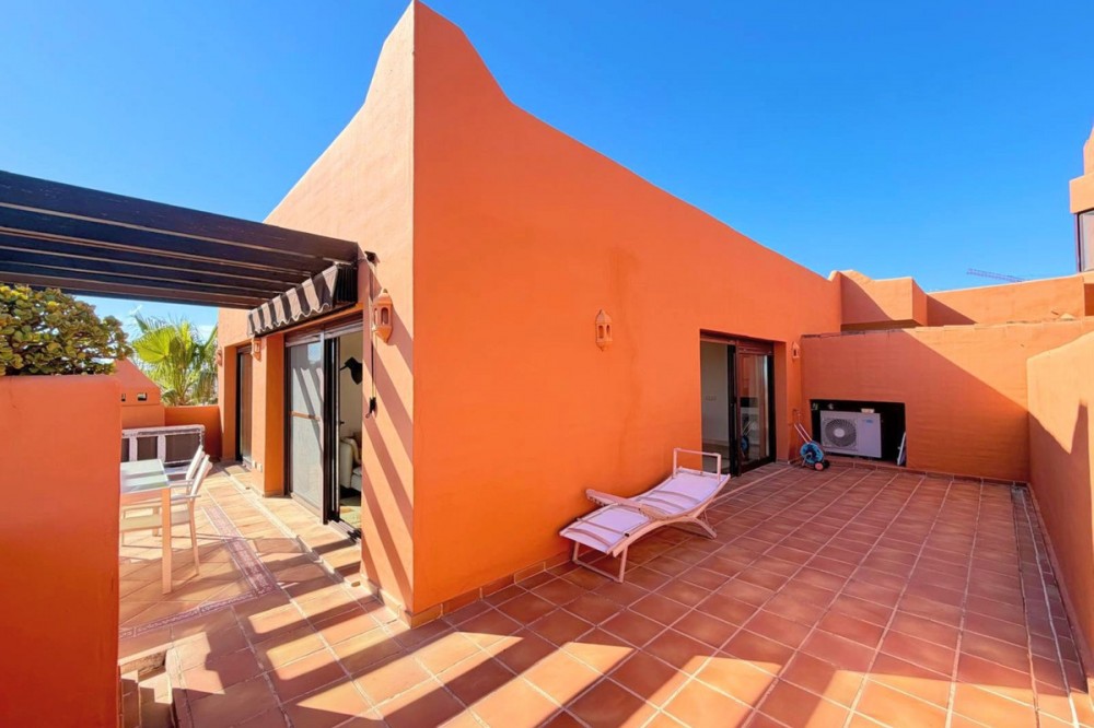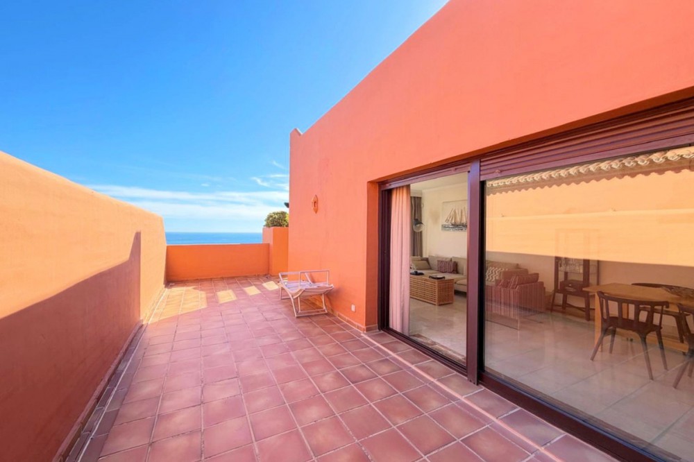 - Spectacular penthouse with a spacious terrace and large solarium, located just 200 m from the beach. Facing southeast to southwest, this bright home enjoys abundant natural light throughout the day thanks to its large windows. Its elevated position offers stunning panoramic views of the sea, the coastline, and even Africa. Built with high-quality materials, it features plumbing from the prestigious brand Grohe, Siemens appliances, and elegant marble floors and bathrooms. Situated in a well-maintained gated community with only 40 homes and a low community fee, surrounded by lush tropical gardens with palm trees, it offers a spectacular infinity pool, extensive play areas, as well as umbrellas and sun loungers for residents’ enjoyment. Just a 5-minute drive from the charming town of Estepona and the lively Puerto de la Duquesa, where you’ll find a wide range of services, shops, and leisure options. The property includes a garage space and storage room. One of the best locations on the Coast! A must-see!