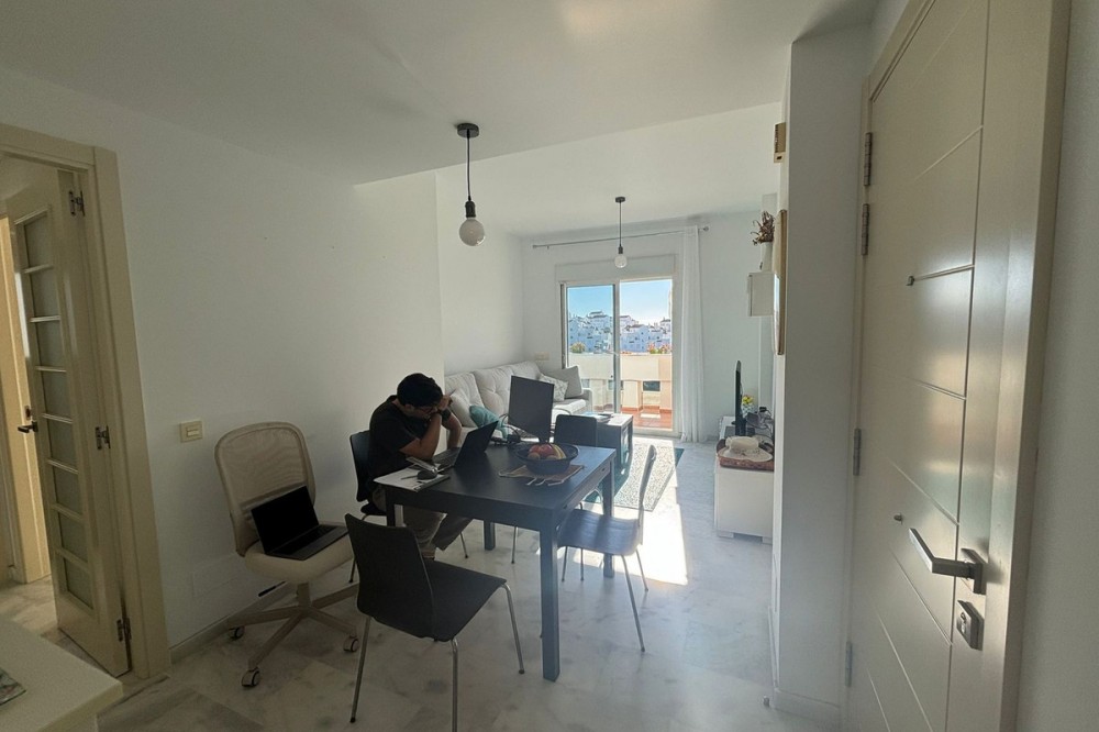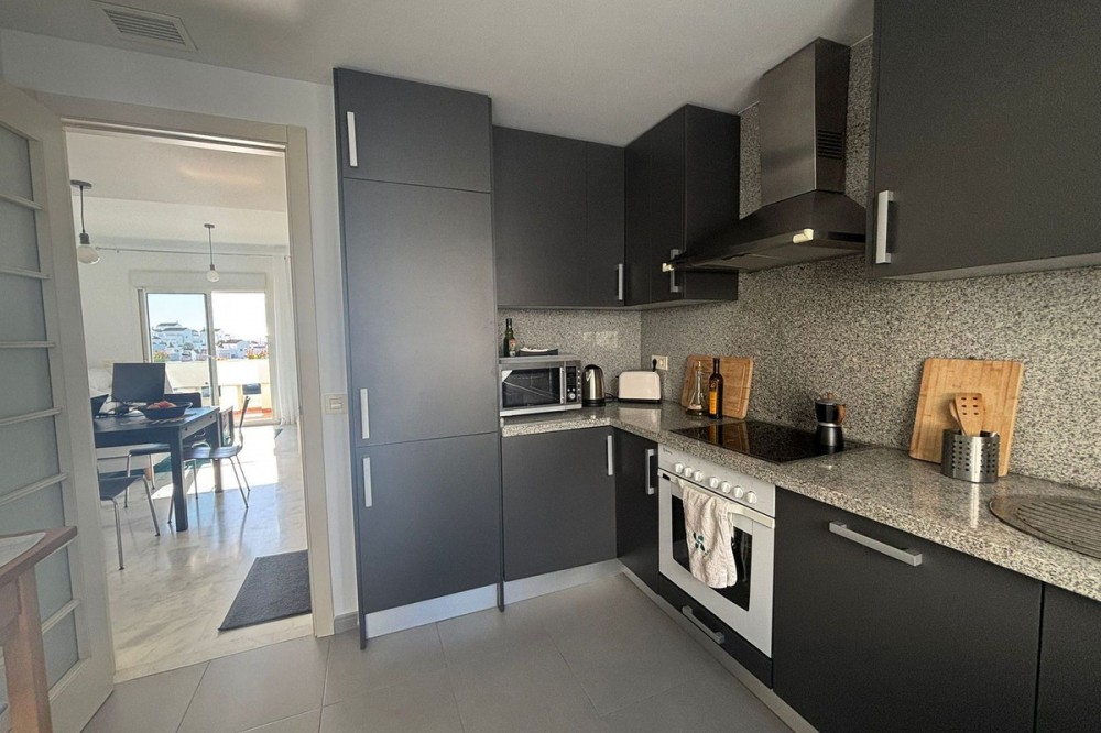 - Penthouse with Private Solarium and Panoramic Sea & Golf Views in Valle Romano, Estepona Discover this bright penthouse located frontline to the golf course in the exclusive Villa Borghese urbanisation, in Valle Romano, Estepona. A property that perfectly combines tranquility, open views, and proximity to both the beach and the town center, just a 8–10 minute drive away. The property stands out for its south-facing orientation and abundant natural light. The spacious living area opens onto a main terrace, ideal for enjoying the Mediterranean climate all year round. From here, a staircase leads to a spectacular private solarium—one of the property’s key highlights—offering stunning panoramic views of the sea and the golf course, perfect as a chill-out area or for entertaining guests. The kitchen is independent, modern, and fully equipped, with direct access to a balcony that adds practicality and ventilation. There are two double bedrooms with built-in wardrobes: the master bedroom with direct access to the main terrace, and a second bedroom with access to a private balcony. Both share a contemporary-style bathroom. The property includes an underground parking space with direct access and features air conditioning (hot and cold) throughout, ensuring year-round comfort. Set within a gated community with landscaped gardens and two communal swimming pools, this penthouse is ideal as a permanent residence, holiday home, or investment opportunity in one of the Costa del Sol’s growing areas.