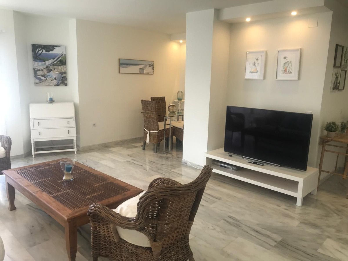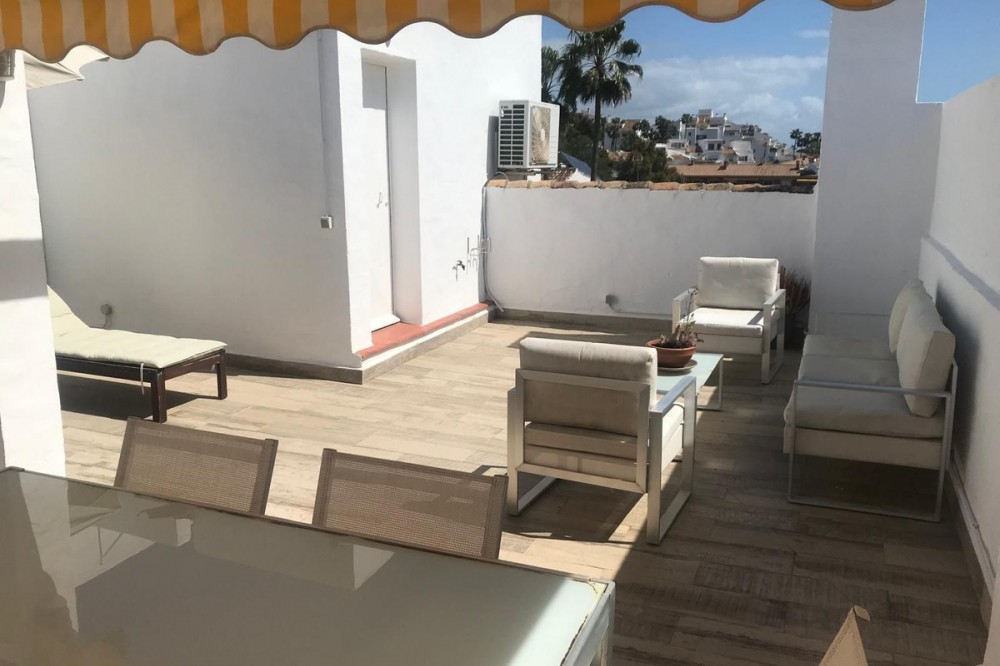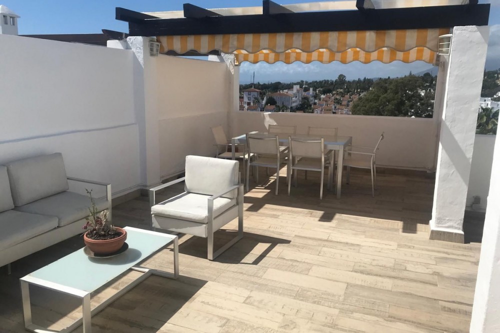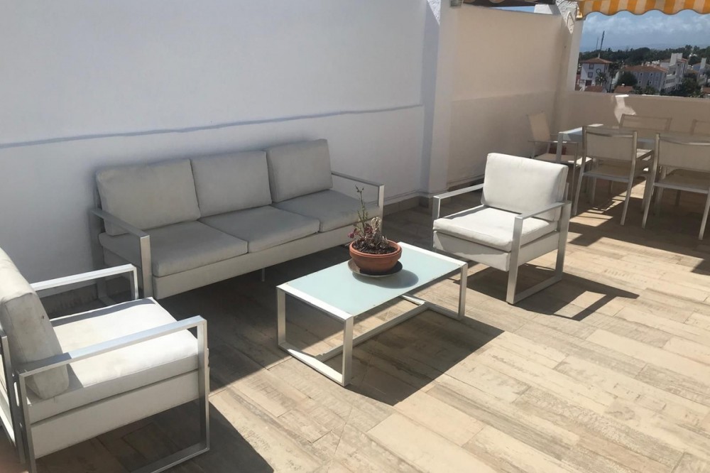 - Discover this charming penthouse situated in a quiet residential area of the New Golden Mile in Estepona, where comfort and stunning views come together to offer you a unique home. The property features two spacious double bedrooms, both with fitted wardrobes, and two full bathrooms, one fitted with a bath and the other with a shower. The kitchen and the bright living-dining room form a cosy open-plan space leading out to a lovely terrace on the same level, overlooking the residential complex. The real gem of this penthouse is its spectacular upper terrace: a spacious and versatile area with views of the sea and the green spaces surrounding the property. Perfect for creating a chill-out atmosphere, enjoying al fresco dining or relaxing on the sun loungers in the sun. There is also a handy storage room on this floor. The property includes a parking space in the communal garage and access to a large swimming pool surrounded by well-tended gardens, offering an ideal setting for rest and relaxation. A cosy, discreet and charming home in a prime location.