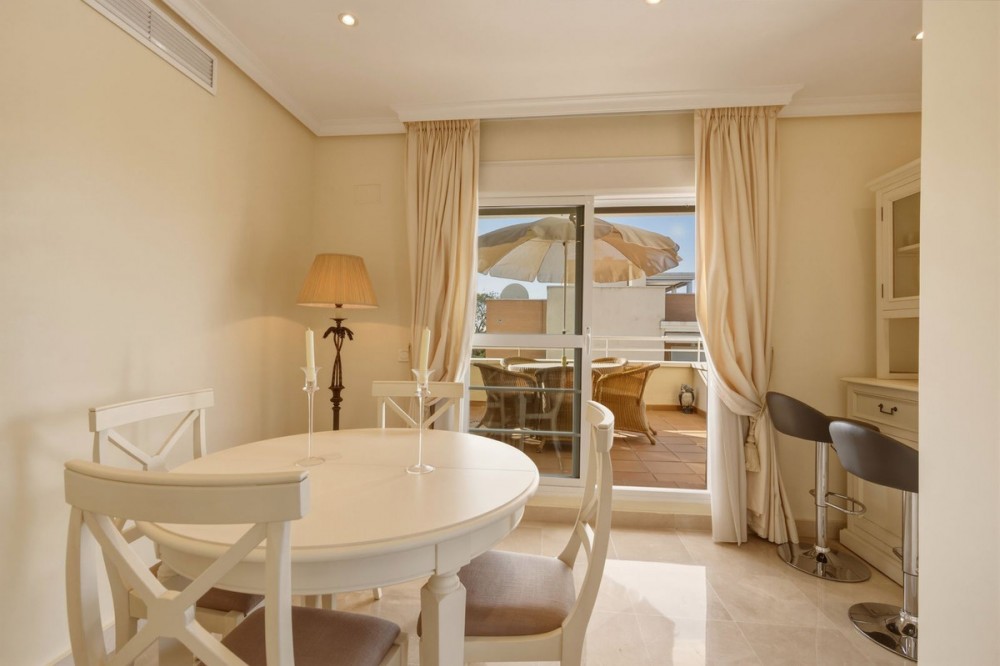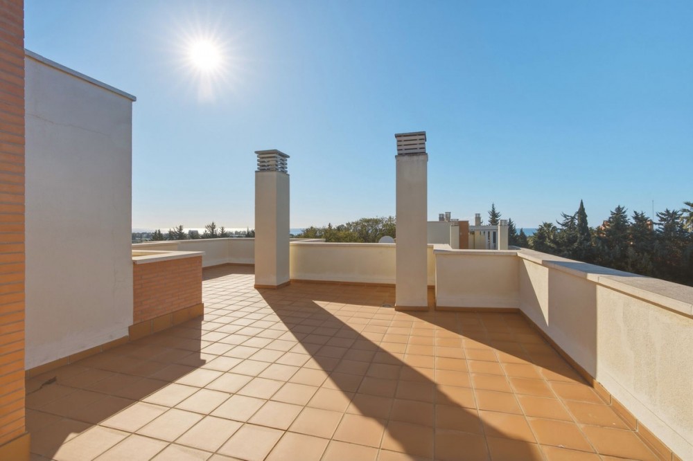 - Spacious penthouse in Dunas Green, corner unit. Exclusive corner penthouse in Dunas Green with a total of 175 m² of terraces. The main terrace faces southwest, enjoying morning sun thanks to the corner position and sun for most of the day, while the rooftop terrace gets sun all day. The property features 3 bedrooms, 2 bathrooms, and 1 guest toilet. Two covered parking spaces located next to each other. Well maintained and sold furnished. The community offers a beautiful pool, two padel courts, and spacious, well kept green areas, especially around the pool. Just a 15 minute walk to the sea.